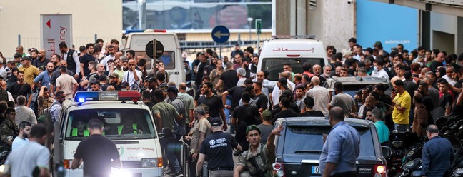 Ambulâncias são cercadas por pessoas na entrada do Centro Médico da Universidade Americana de Beirute,em 17 de setembro de 2024,após explosões de pagers em várias áreas dominadas pelo Hezbollah em todo o Líbano — Foto: Anwar AMRO / AFP