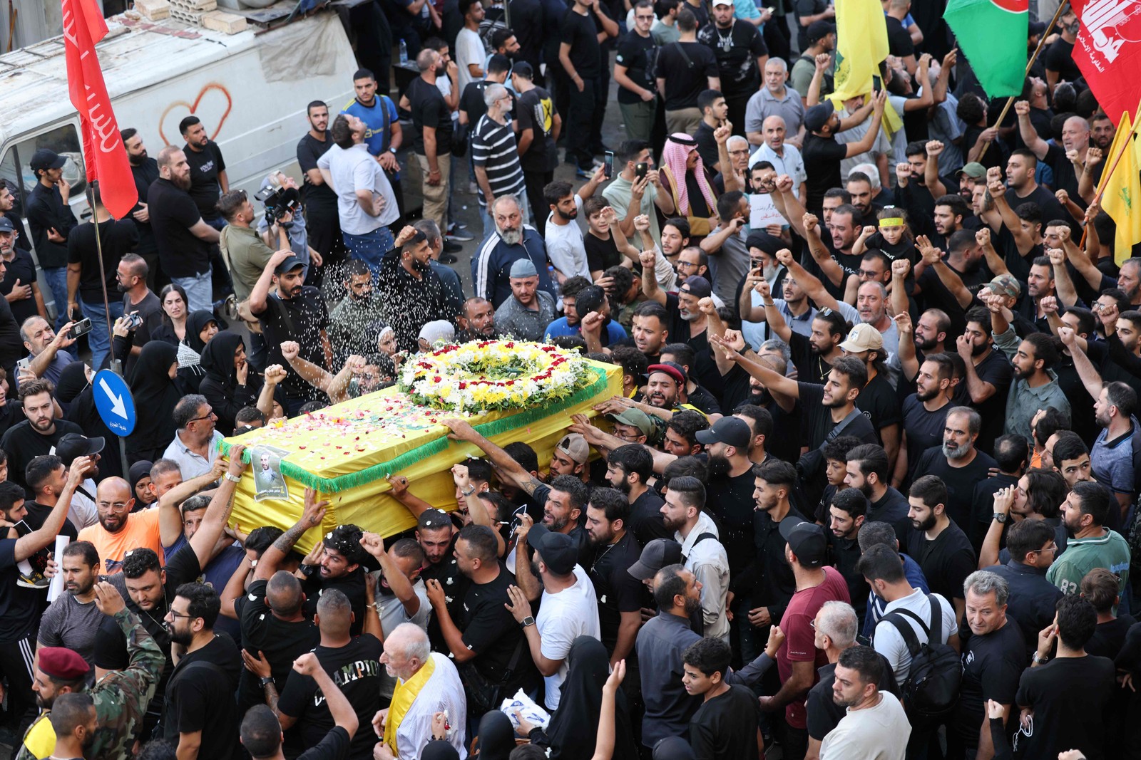 Pessoas em luto acompanham caixão de vítima de uma das explosões de pagers ocorridas no Líbano,no dia 17 de setembro de 2024 — Foto: Anwar AMRO / AFP