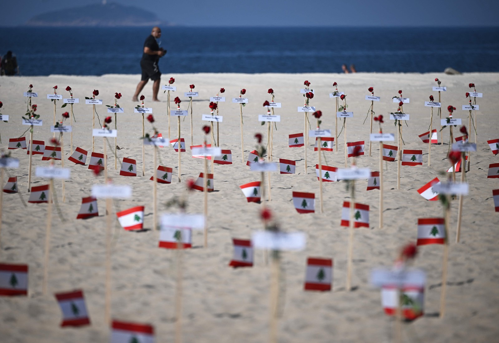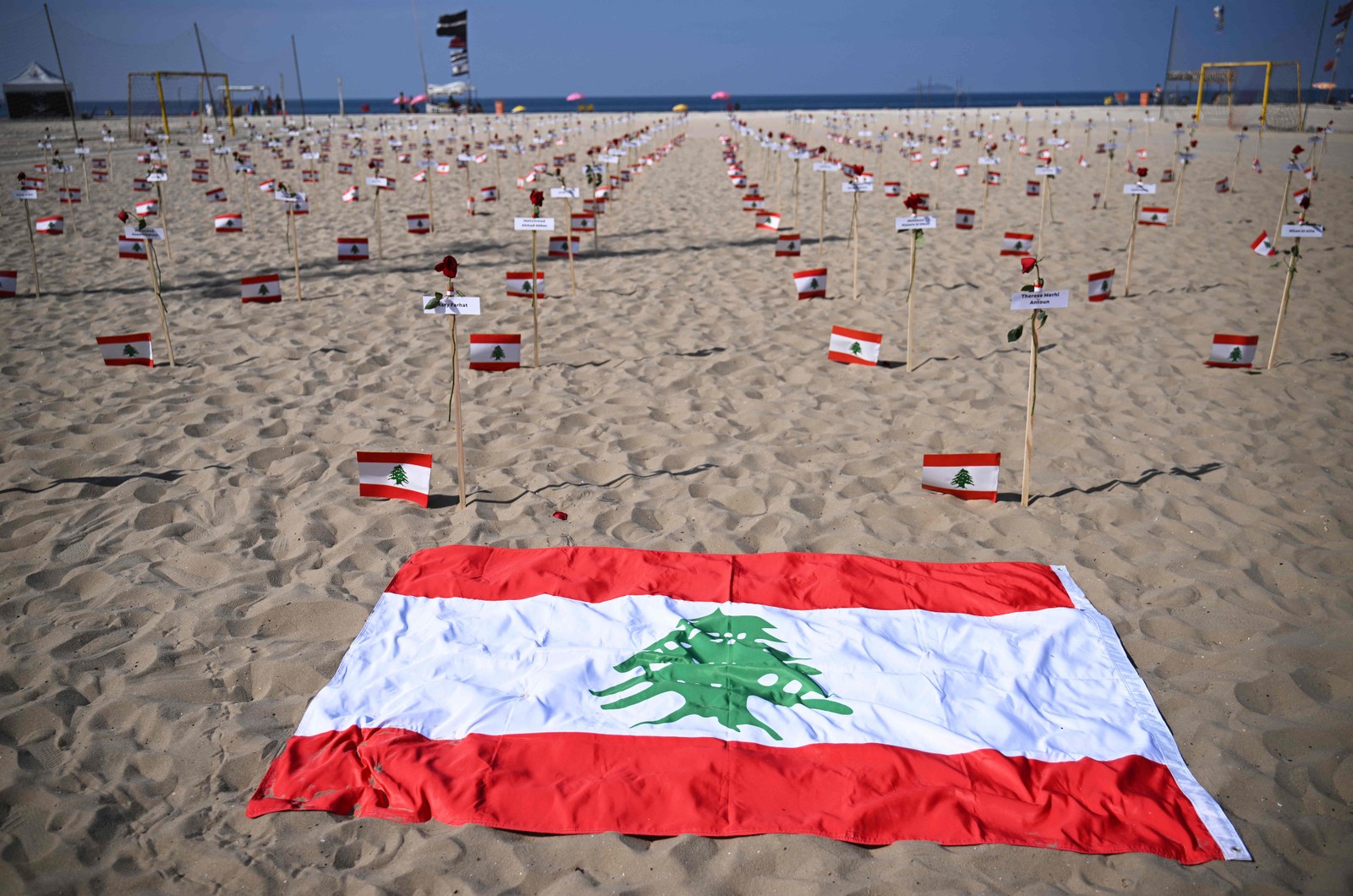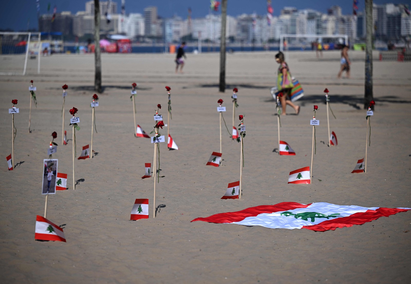 245 rosas foram fincadas na areia de Copacabana com os nomes das vítimas e bandeiras libanesas — Foto: Carl de Souza / AFP