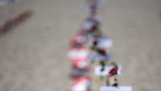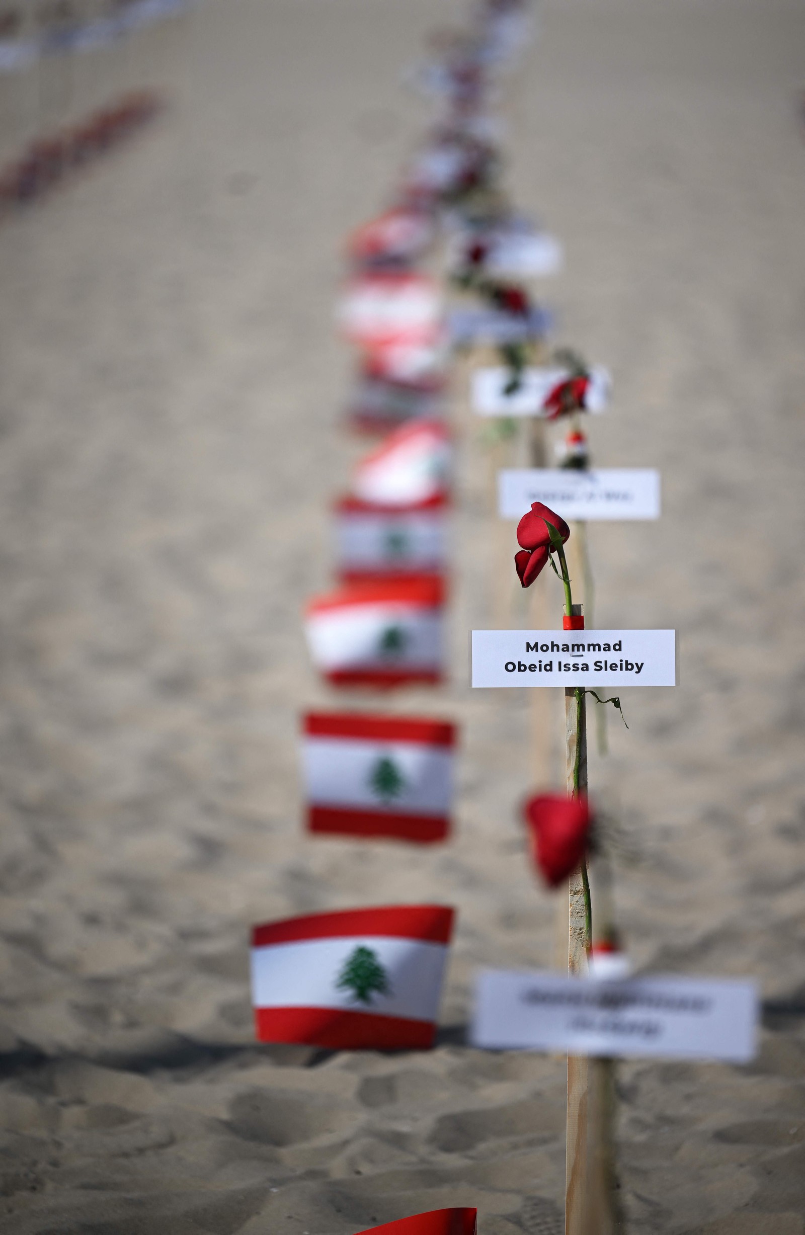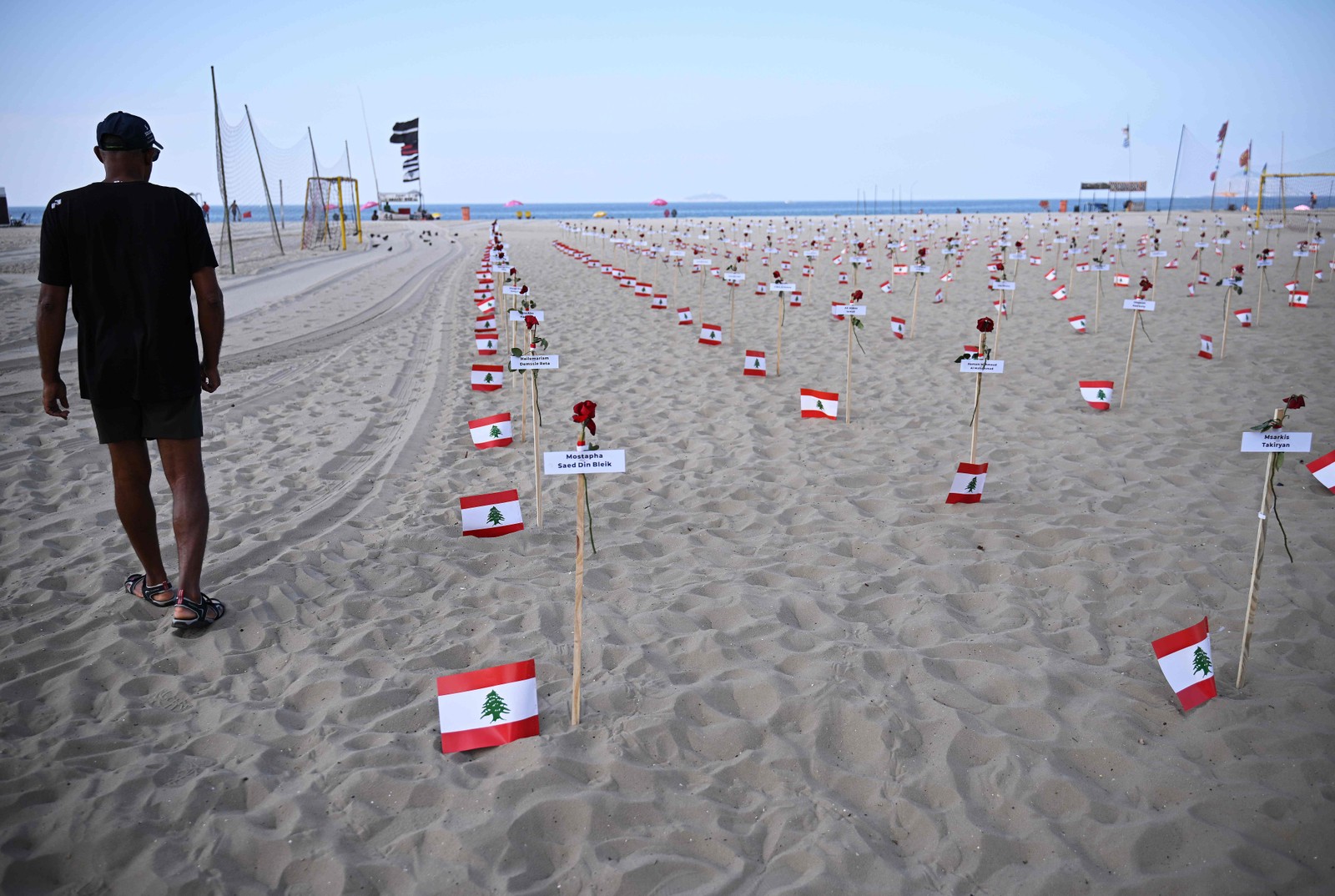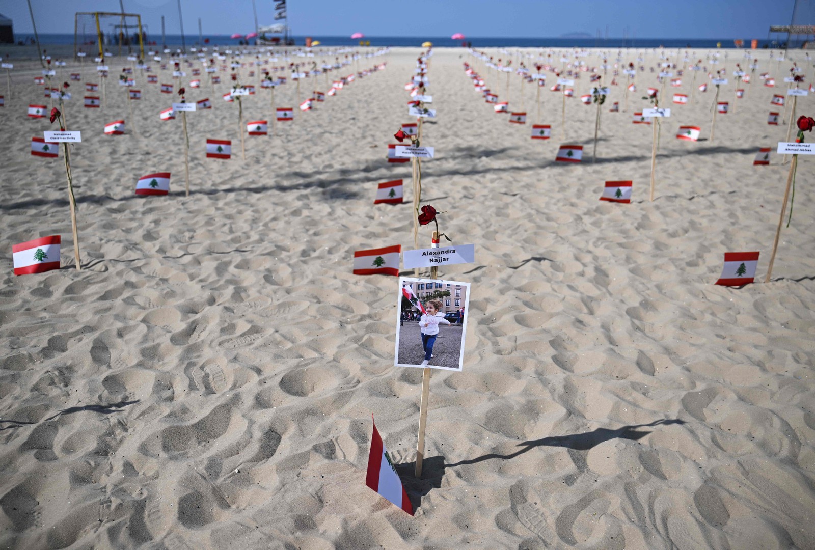 245 rosas foram fincadas na areia de Copacabana com os nomes das vítimas e bandeiras libanesas — Foto: Carl de Souza / AFP