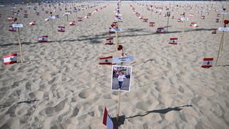 Publicidade Rosas com nomes de vítimas foram colocadas em Copacabana; explosão no porto da capital libanesa deixou 245 mortos e mais de 6 mil feridos em 4 de agosto de 2020