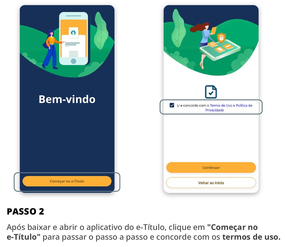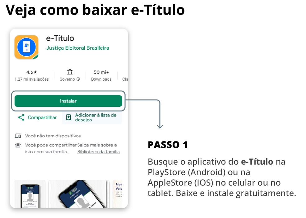 Passo 1. Busque o aplicativo do e-Título na PlayStore (smartphone Android) e na AppleStore (IOS) no celular ou no tablet. Baixe e instale gratuitamente.