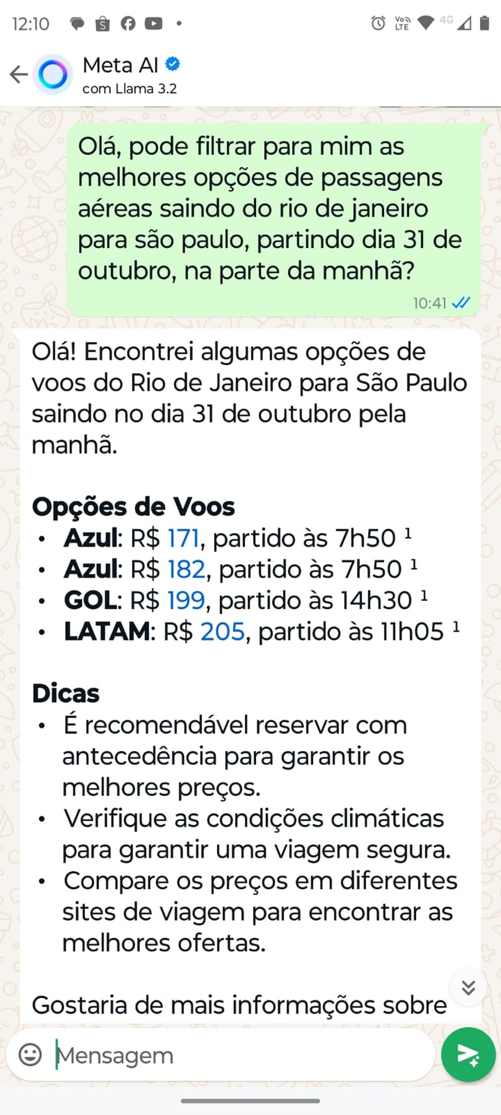 Meta IA te ajuda a encontrar passagens. Veja: — Foto: Arquivo pessoal