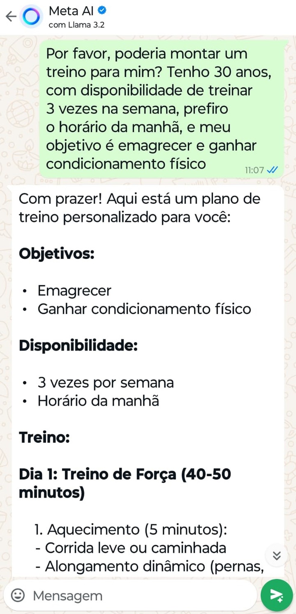 Clique no circulo da Meta AI que fica no canto inferior da tela para começar uma conversa;Na conversa,peça para que IA monte uma série de treino para você,especificando quantos anos tem,quais resultados deseja alcançar e sua disponibilidade durante a semana. Não deixe de especificar o que for importante para você,pois a tecnologia se baseará no seu comando;O chat te enviará um plano de exercícios detalhado,mas também aconselha seguir orientações de profissionais.Lembrando que é importante contar com a supervisão de um profissional de educação física ao iniciar uma atividade física.
