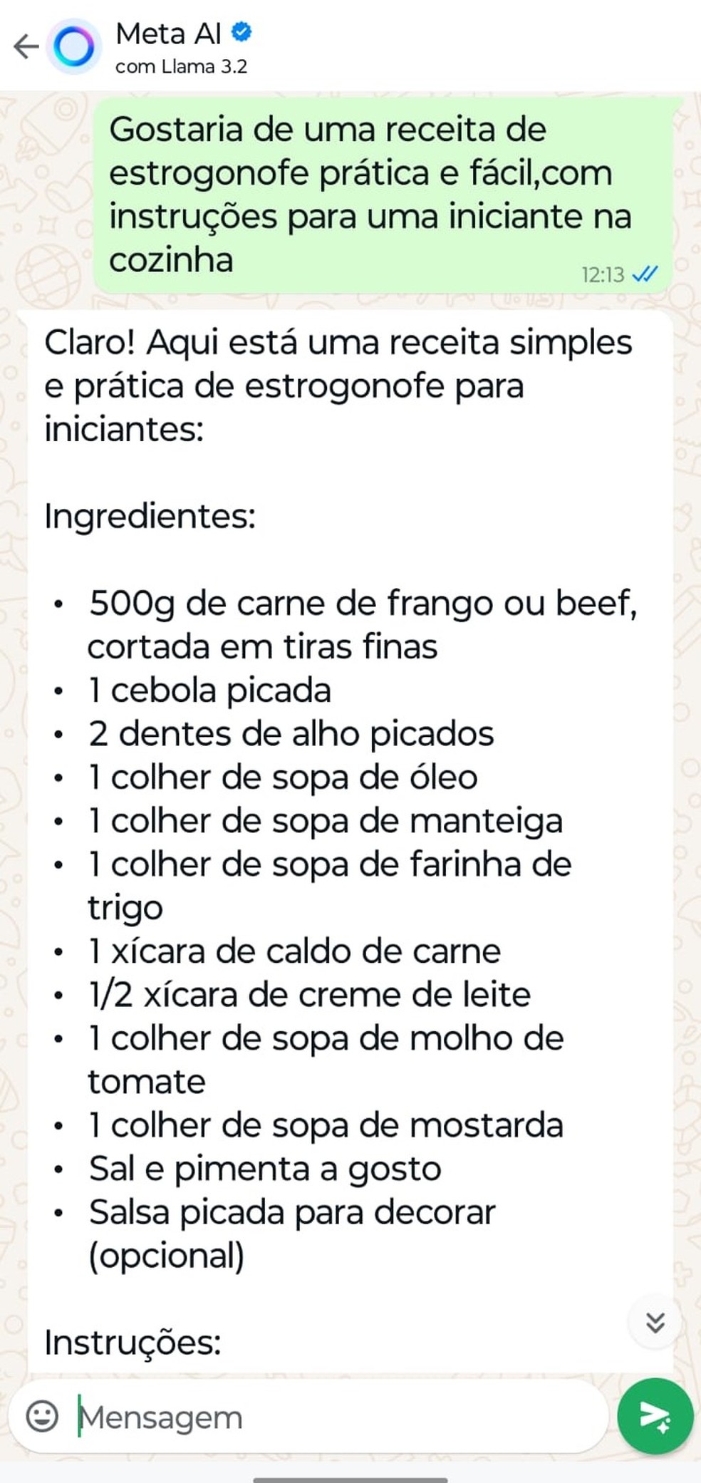 Clique no circulo da Meta AI que fica no canto inferior da tela para começar uma conversa;Na conversa,peça para que IA te envie uma receita que deseja cozinhar. Para melhorar o comando,detalhe o que deseja o máximo possível;O chat listará os ingredientes que vai precisar,como será o modo de preparo e algumas dicas sobre a receita.