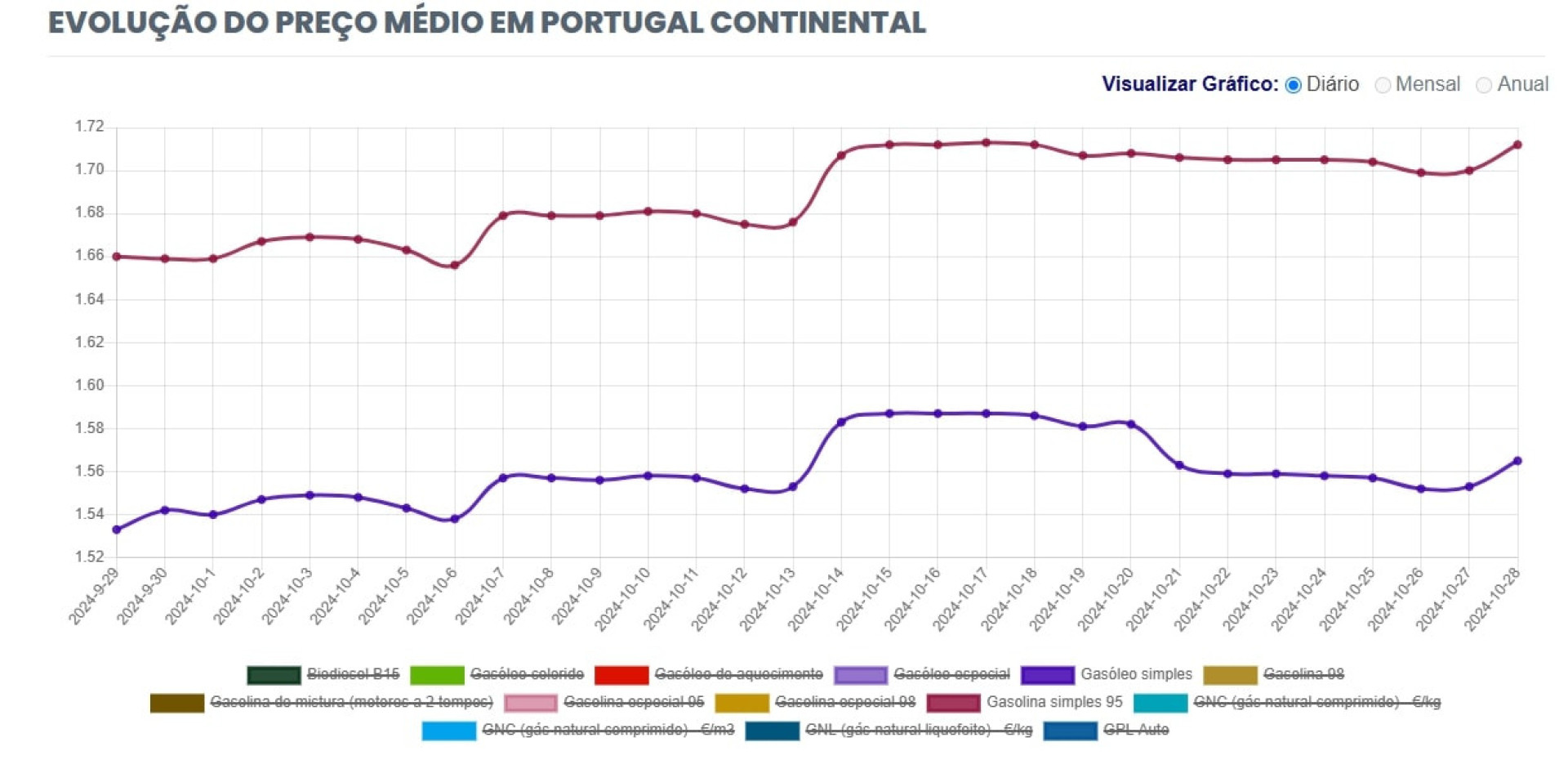 De acordo com os dados da Direção-Geral de Energia e Geologia (DGEG),na segunda-feira,29 de outubro,o preço médio do gasóleo simples tinha subido,estando nos 1,565 euros por litro,e o da gasolina simples 95 também aumentou,para os 1,712 euros por litro.