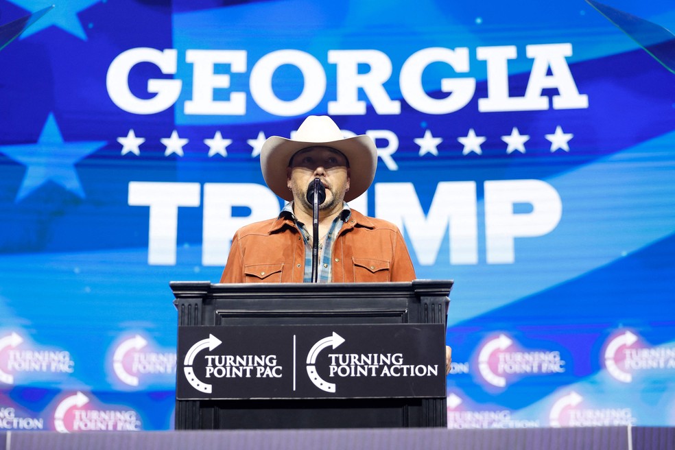 O cantor Jason Aldean em comício de campanha do Turning Point PAC para o candidato Donald Trump,na Geórgia — Foto: Foto de Anna Moneymaker/GETTY IMAGES NORTH AMERICA/Getty Images via AFP