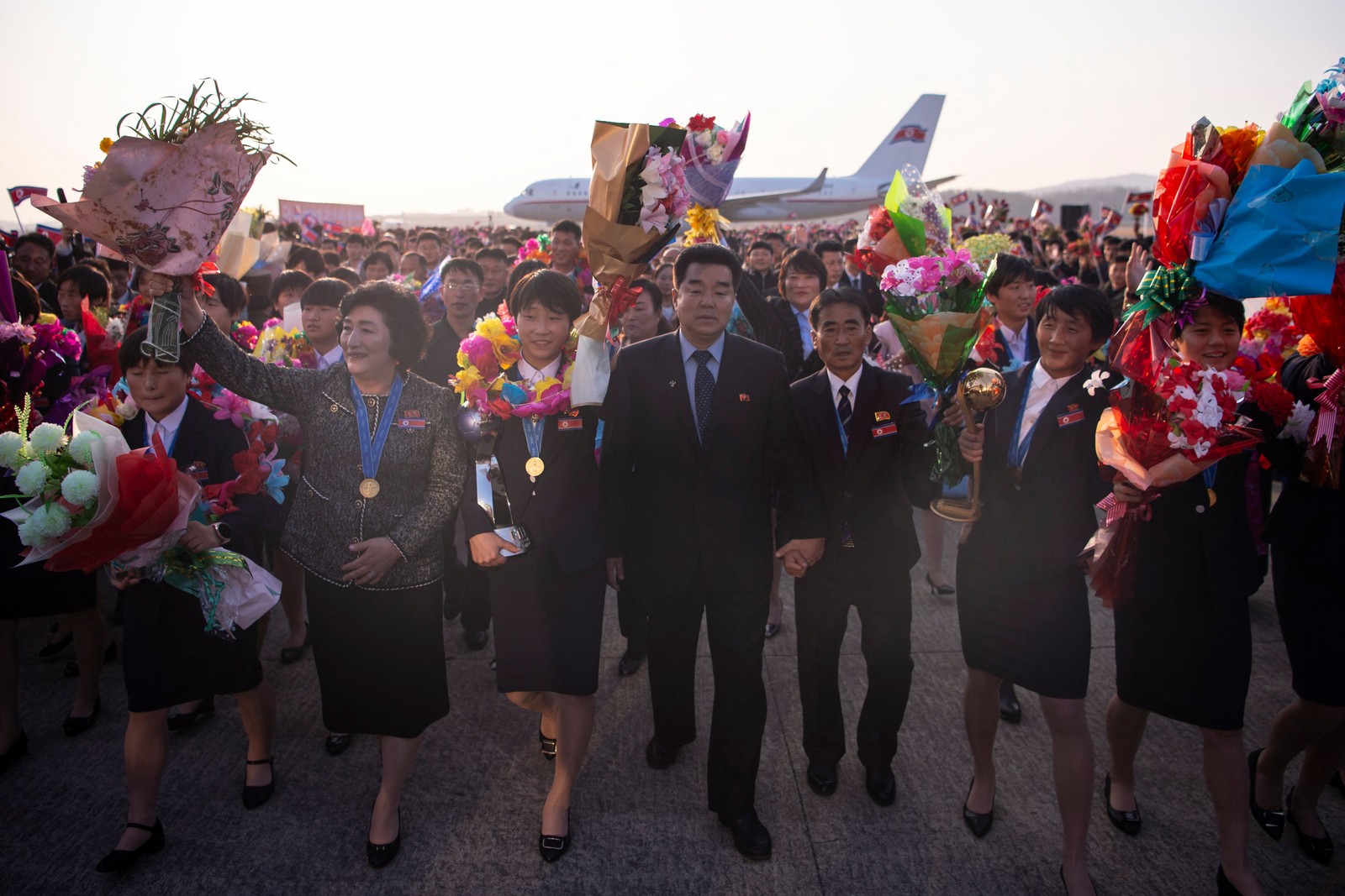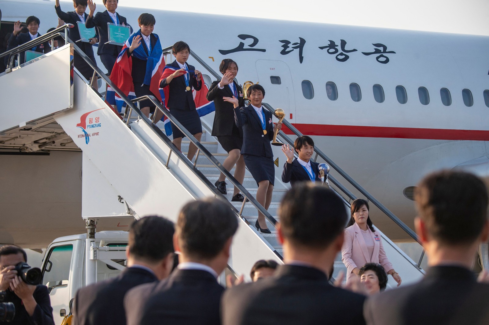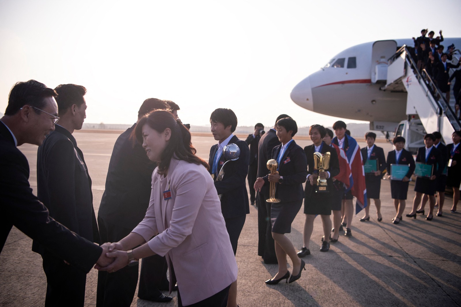 Autoridades e familiares das jogadoras se reuniram no Aeroporto Internacional de Pyongyang para agitar flores e bandeiras da Coreia do Norte enquanto o avião se aproximava do portão de desembarque. Jogadoras empolgadas e suas famílias comemoraram juntos,com uma mãe,vestida com o tradicional traje coreano hanbok,dizendo à filha jogadora: "Você trabalhou muito".