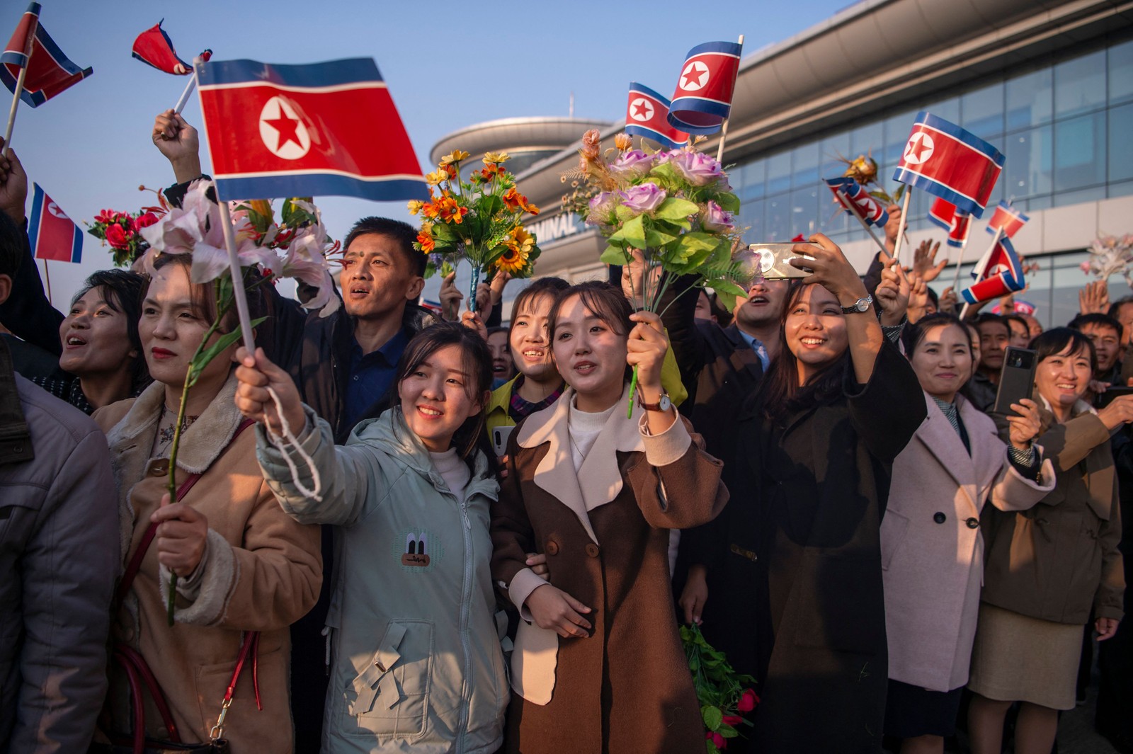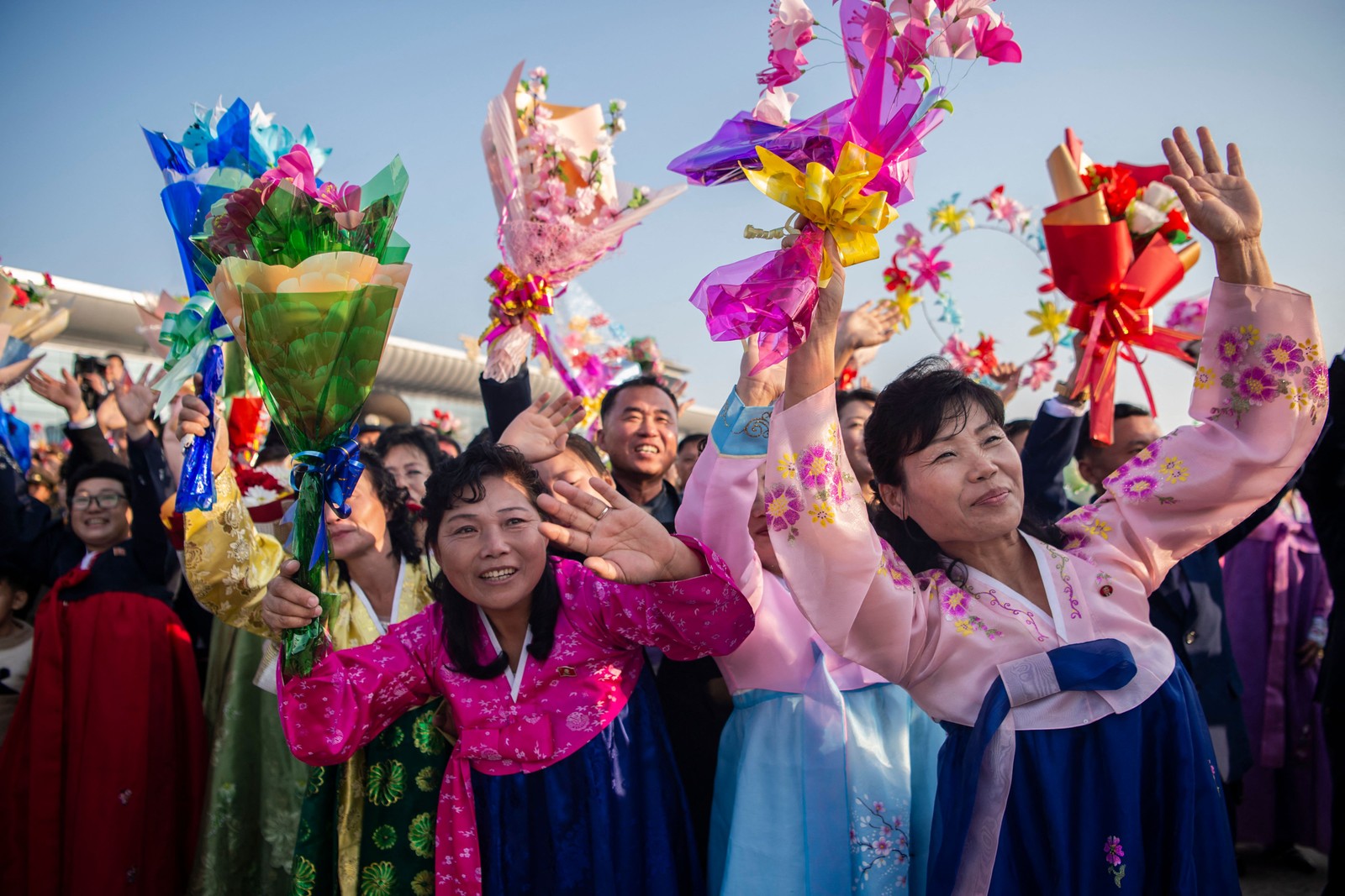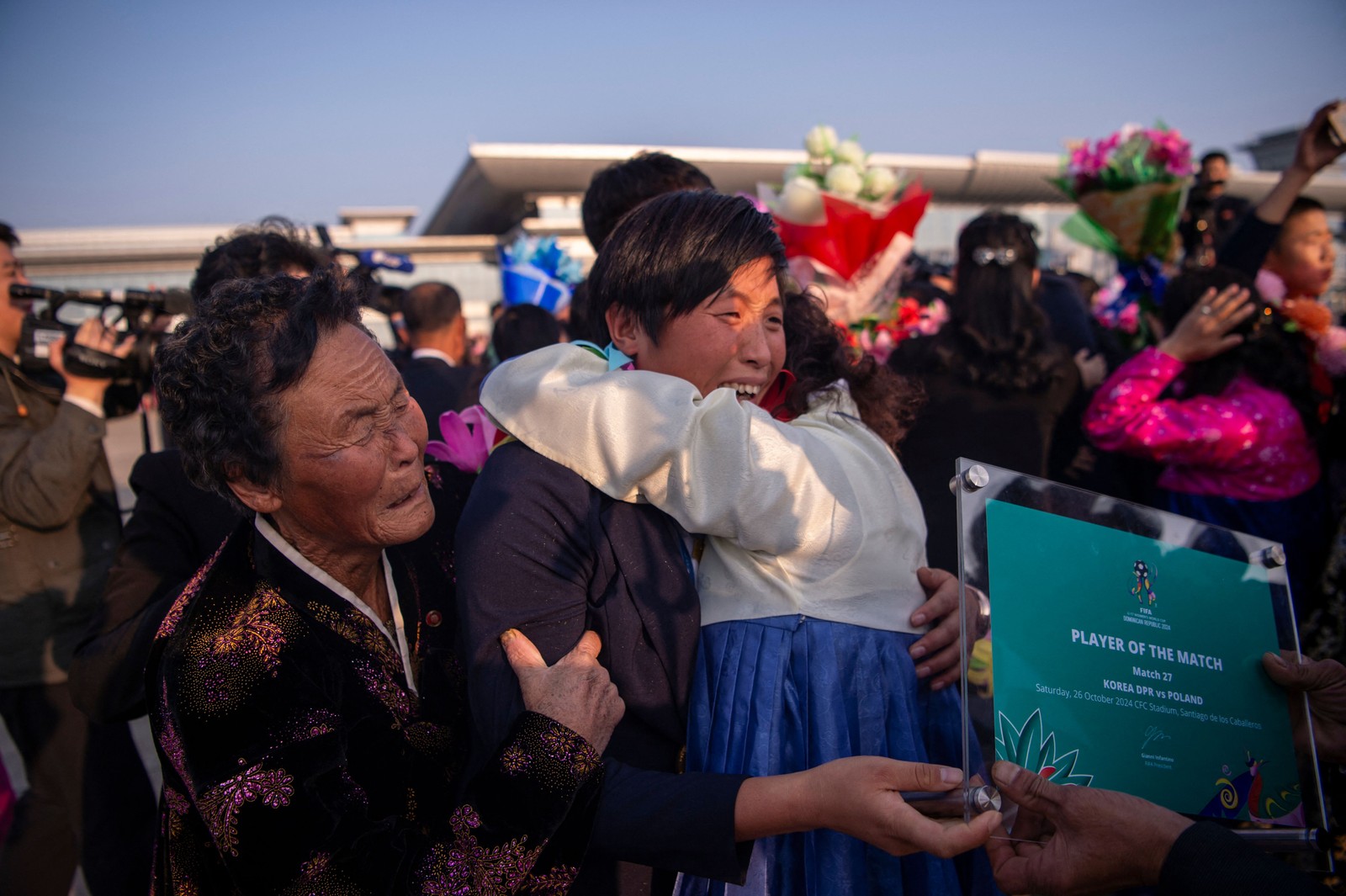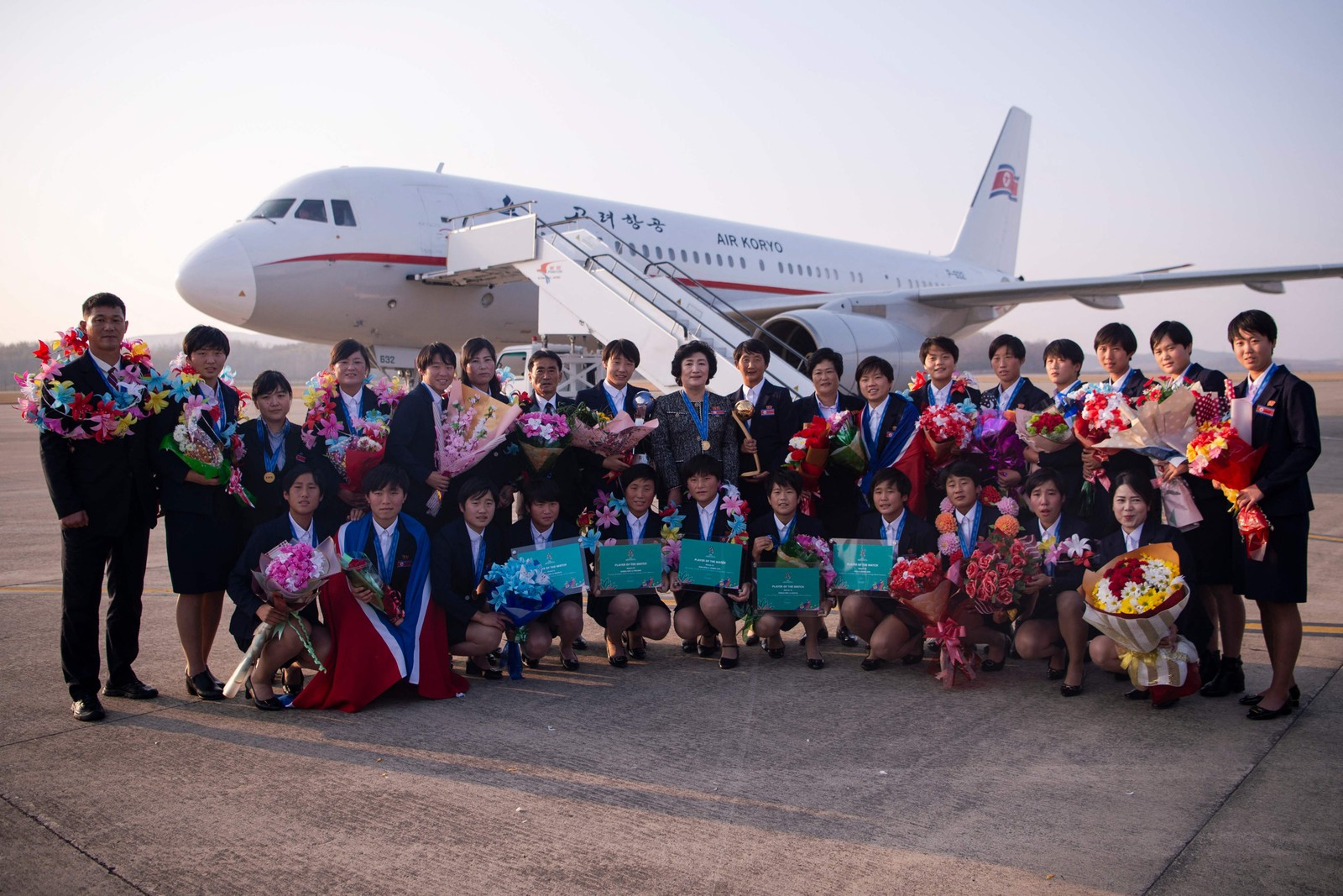 Autoridades e familiares das jogadoras se reuniram no Aeroporto Internacional de Pyongyang para agitar flores e bandeiras da Coreia do Norte enquanto o avião se aproximava do portão de desembarque. Jogadoras empolgadas e suas famílias comemoraram juntos,com uma mãe,vestida com o tradicional traje coreano hanbok,dizendo à filha jogadora: "Você trabalhou muito".