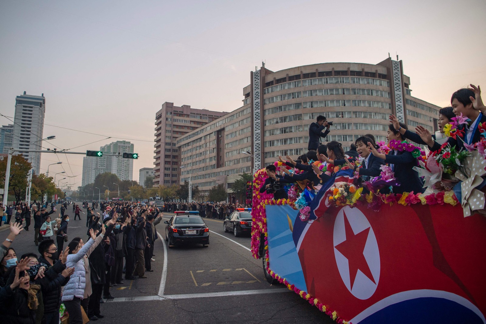 A seleção foi,então,para um desfile em um caminhão aberto decorado com flores e pintado com a bandeira da Coreia do Norte — Foto: Kim Won Jin/AFP