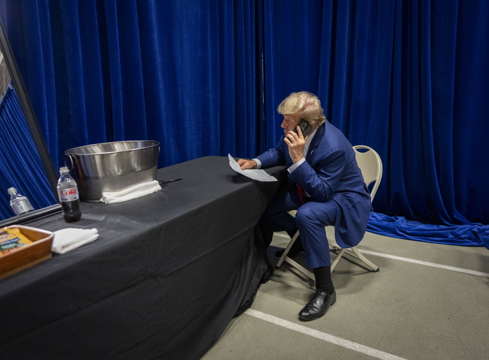 Trump faz ligações para eleitores nos bastidores após uma aparição de campanha presidencial em Warren,Michigan — Foto: Doug Mills/The New York Times