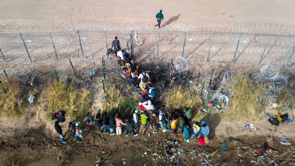 Imigrantes passam por arame farpado para cruzar fronteira México-EUA — Foto: JOHN MOORE/AFP
