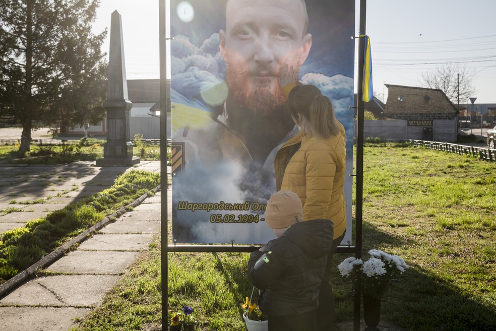 Iryna Sharhorodska com seu filho Tymofii toca em um grande retrato de seu falecido marido Oleksandr Sharhorodskyi,em Trebukiv,Ucrânia — Foto: Nicole Tung/The New York Times