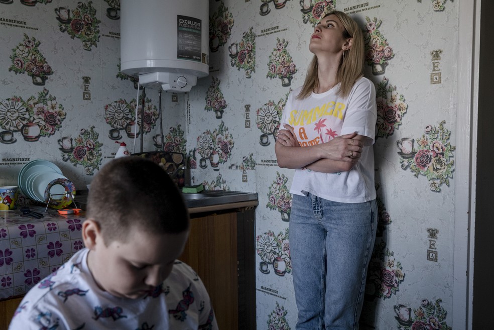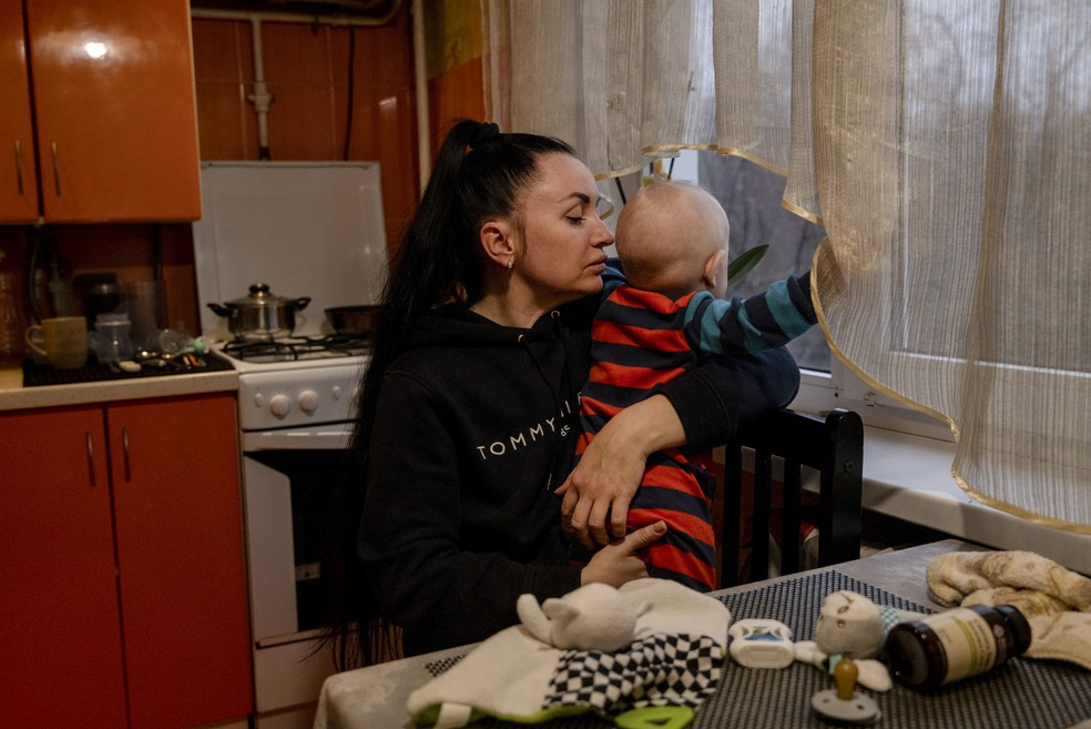 Viktoriia Zavhorodnia olha pela janela com seu filho Roman em sua casa em Zaporíjia,Ucrânia — Foto: Nicole Tung/The New York Times