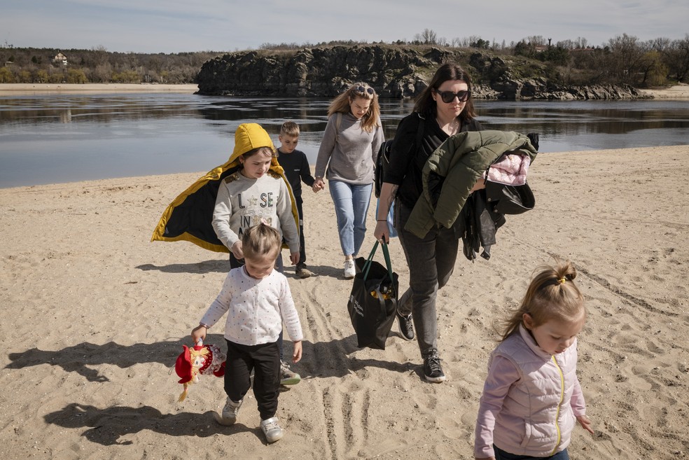 Kateryna Dementiy,à direita,no meio,caminham com seus filhos na praia em Zaporíjia,Ucrânia — Foto: Nicole Tung/The New York Times