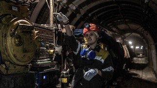 Karina Yatsina,operadora de máquina subterrânea em seu quinto dia de trabalho em uma mina de carvão perto da cidade de Pavlograd,na região de Dnipro,no leste da Ucrânia — Foto: Finbarr O'Reilly/The New York Times