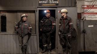 Uma geóloga espera com seus colegas para pegar um elevador de volta à superfície de uma mina perto da cidade de Pokrovsk,na região de Donetsk,no leste da Ucrânia — Foto: Finbarr O'Reilly/The New York Times