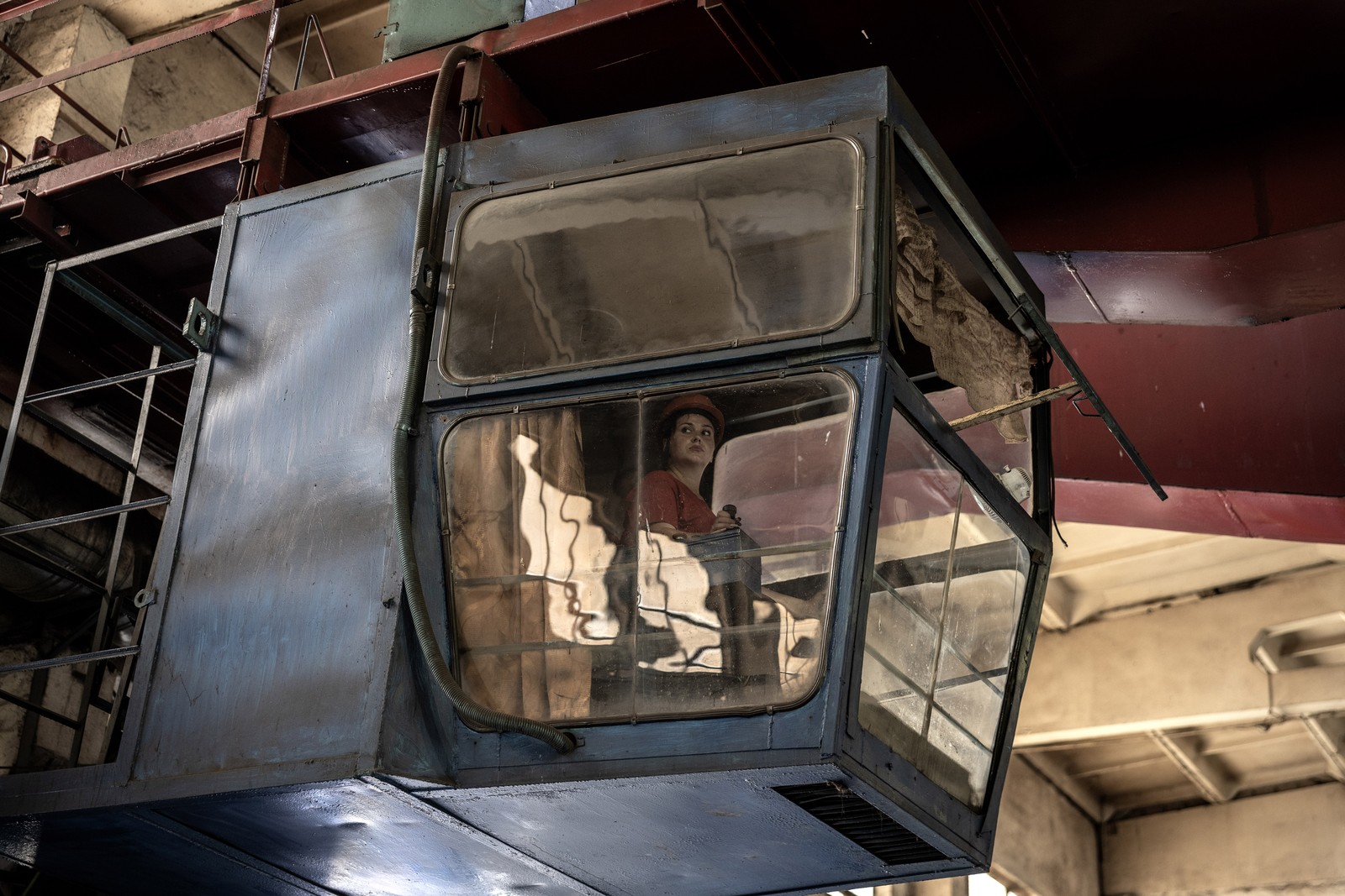 Valentyna Korotaeva opera um guindaste em uma mina de carvão administrada pela siderúrgica Metinvest perto da cidade de Pokrovsk,no leste da Ucrânia — Foto: Finbarr O'Reilly/The New York Times