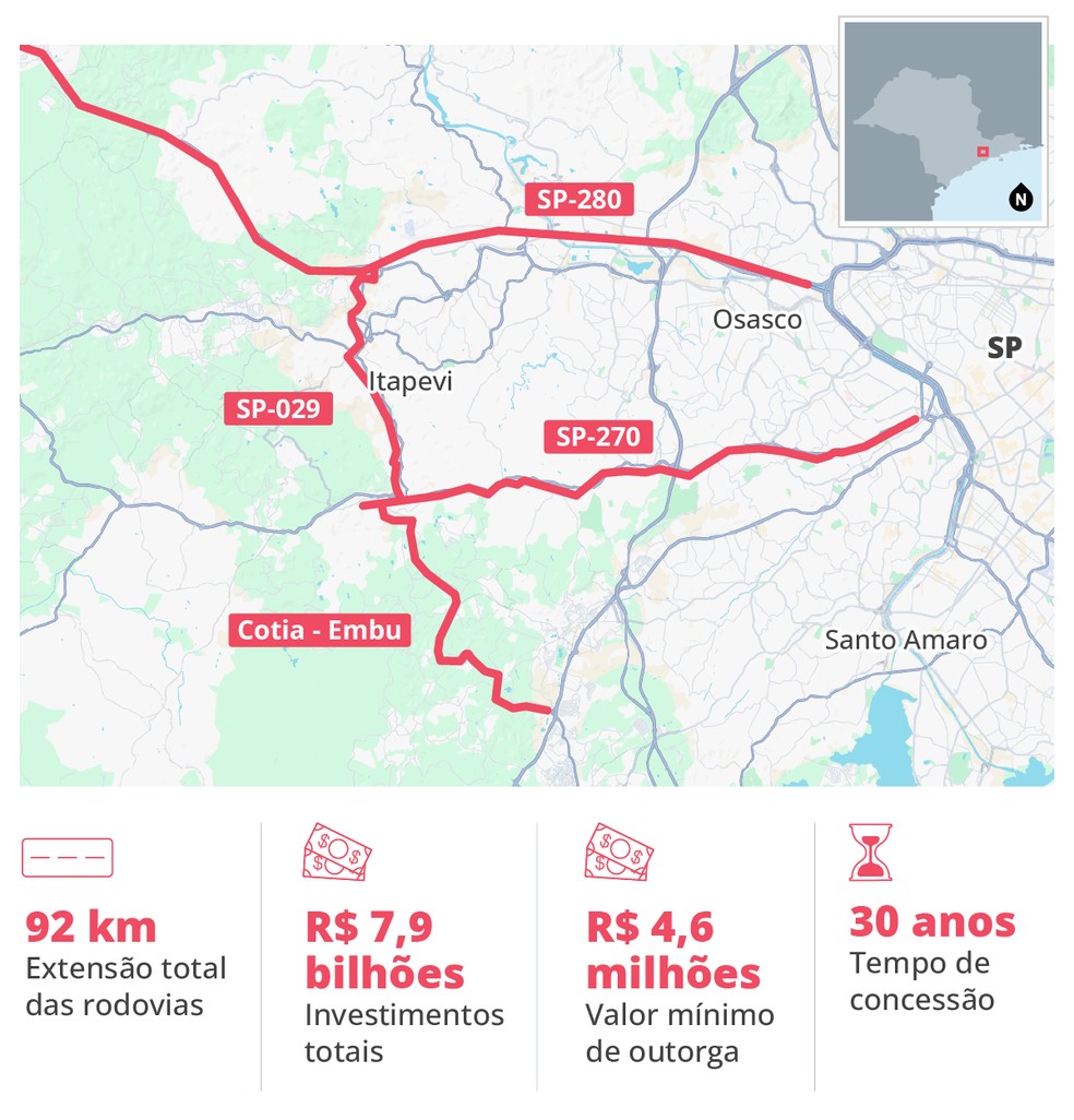 A Ecorodovias ofereceu R$ 2,19 bilhões como outorga,valor bem acima do mínimo estabelecido pelo governo de São Paulo,de R$ 4,6 milhões. O contrato abrange as rodovias Raposo Tavares (SP-270),Castelo Branco (SP-280) e Coronel PM Nelson Tranchesi (SP-029),além de um trecho que conecta os municípios de Cotia e Embu das Artes.
