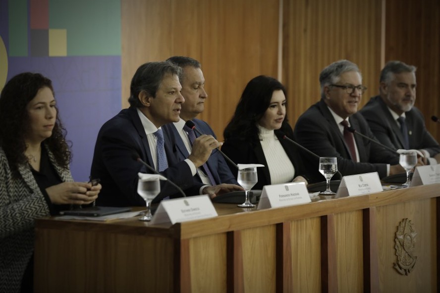 Os ministros Esther Dweck (Gestão),Fernando Haddad (Fazenda),Rui Costa (Casa Civil),Simone Tebet (Planejamento),Alexandre Padilha (Relações Institucinais) e Paulo Pimenta (Secom) falam sobre pacot