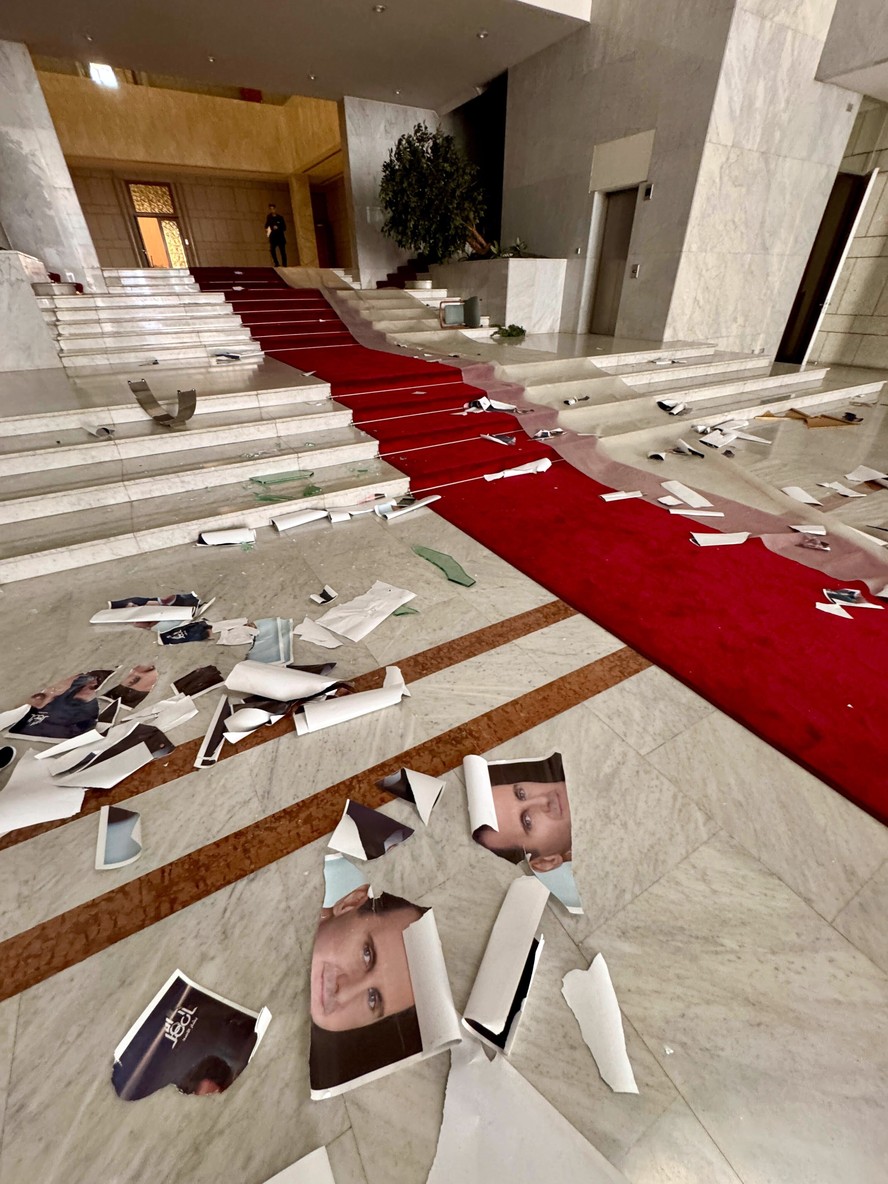 Fotos rasgadas do ex-ditador sírio Bashar al-Assad jogadas no chão do Palácio Presidencial em Damasco — Foto: Ben Hubbard/The New York Times