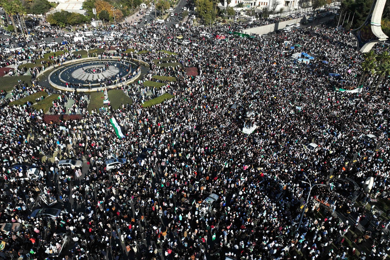 Multidões de sírios levantando a bandeira da era da independência,usada pela oposição desde o início do levante em 2011,enquanto comemoram a queda de Bashar al-Assad no início desta semana na praça central Umayyad,em Damasco — Foto: OMAR HAJ KADOUR / AFP