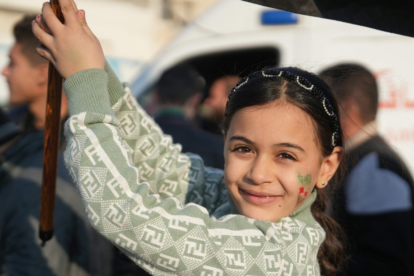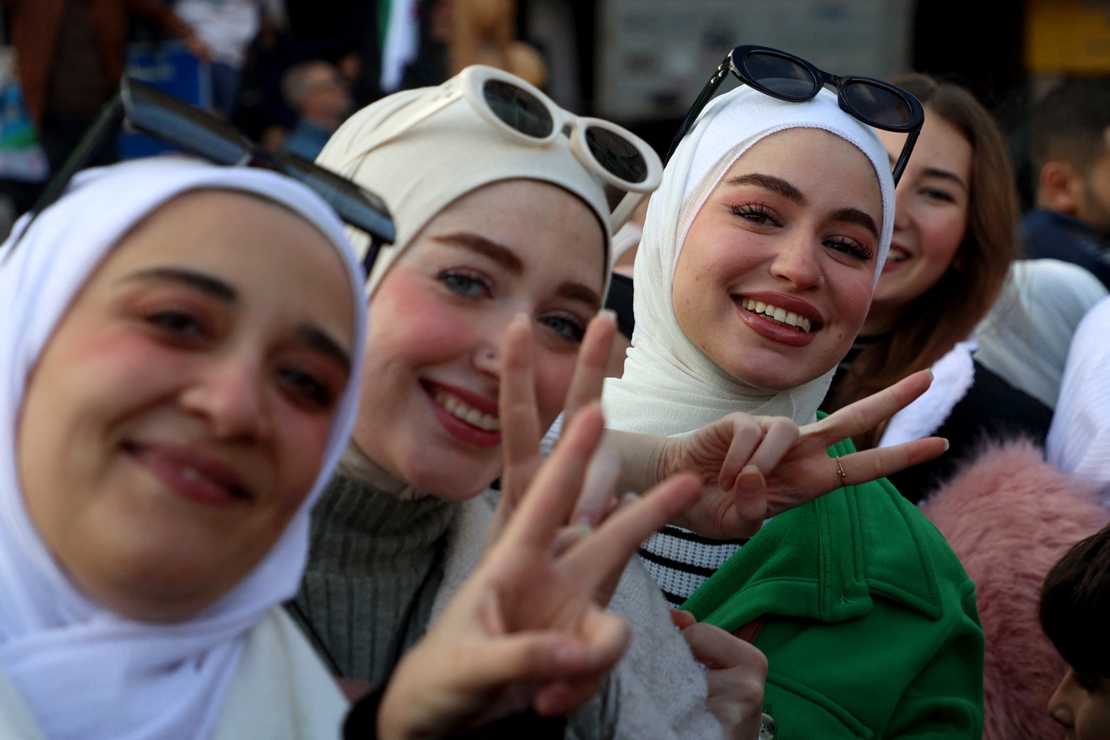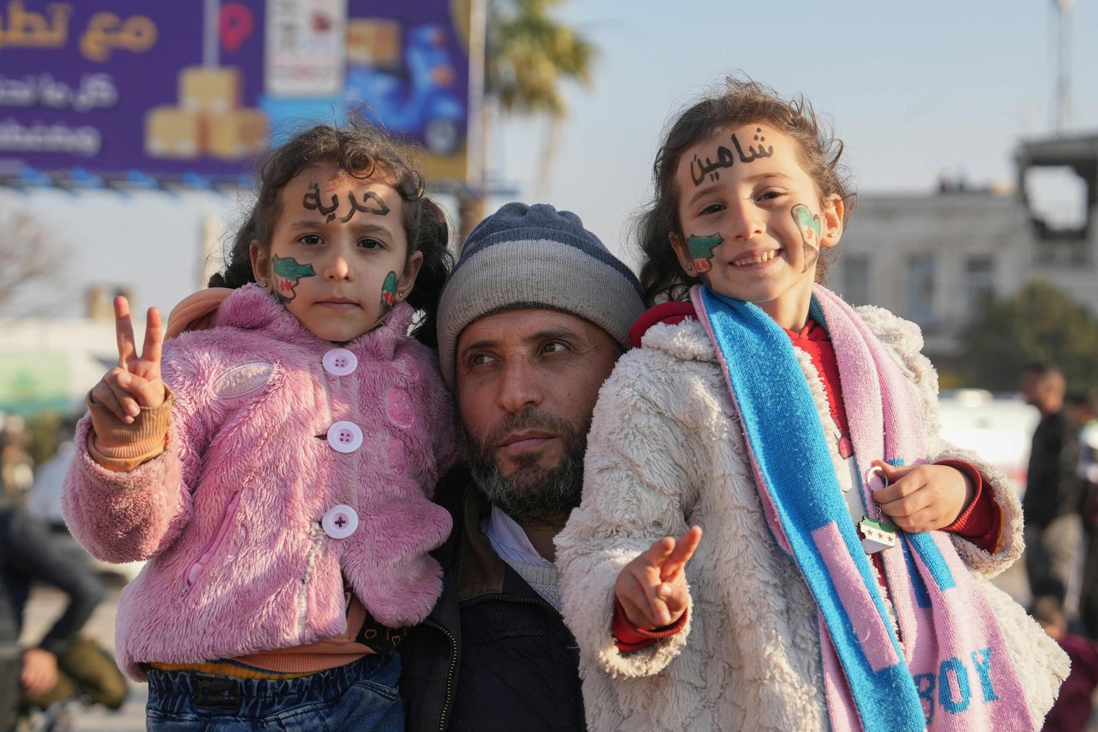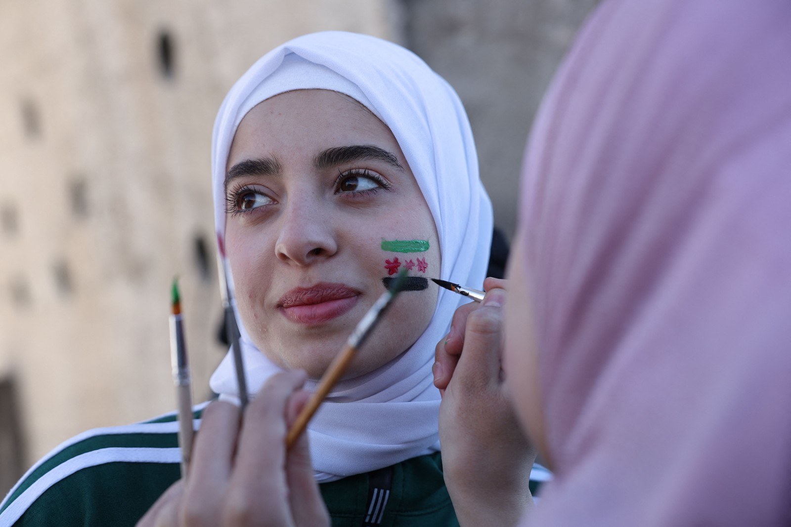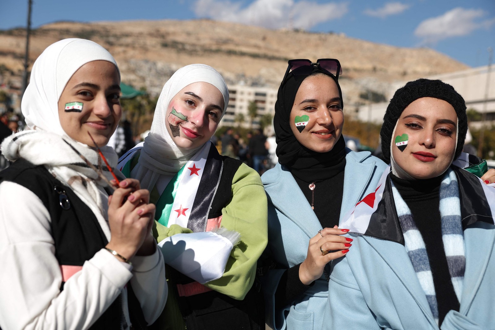 Sírias com a bandeira da era da independência,usada pela oposição desde o início da revolta em 2011,pintadas nos seus rostos posam para uma fotografia durante as celebrações da derrubada do presidente Bashar al-Assad,esta semana,na Praça Umayyad,no centro de Damasco — Foto: OMAR HAJ KADOUR / AFP