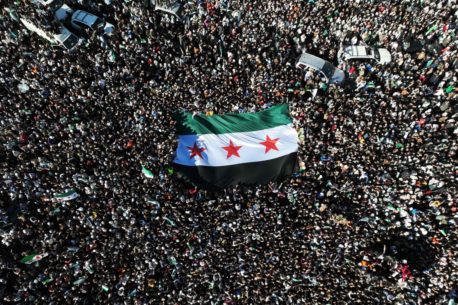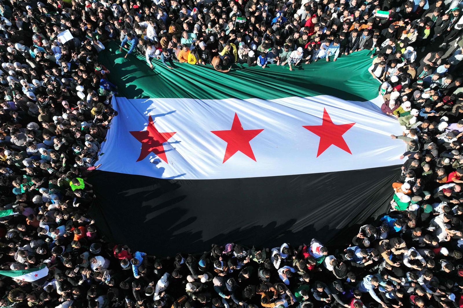 Multidões de sírios levantando a bandeira da era da independência,em Damasco — Foto: Omar HAJ KADOUR / AFP