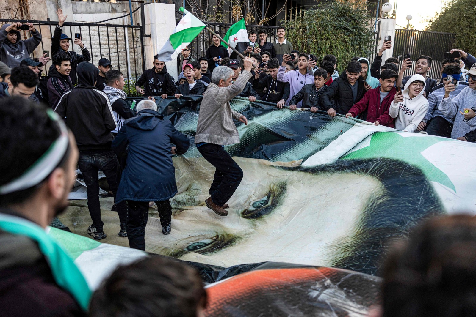 Sírios pisam em banner gigante do presidente deposto,Bashar al-Assad — Foto: Sameer Al-DOUMY / AFP