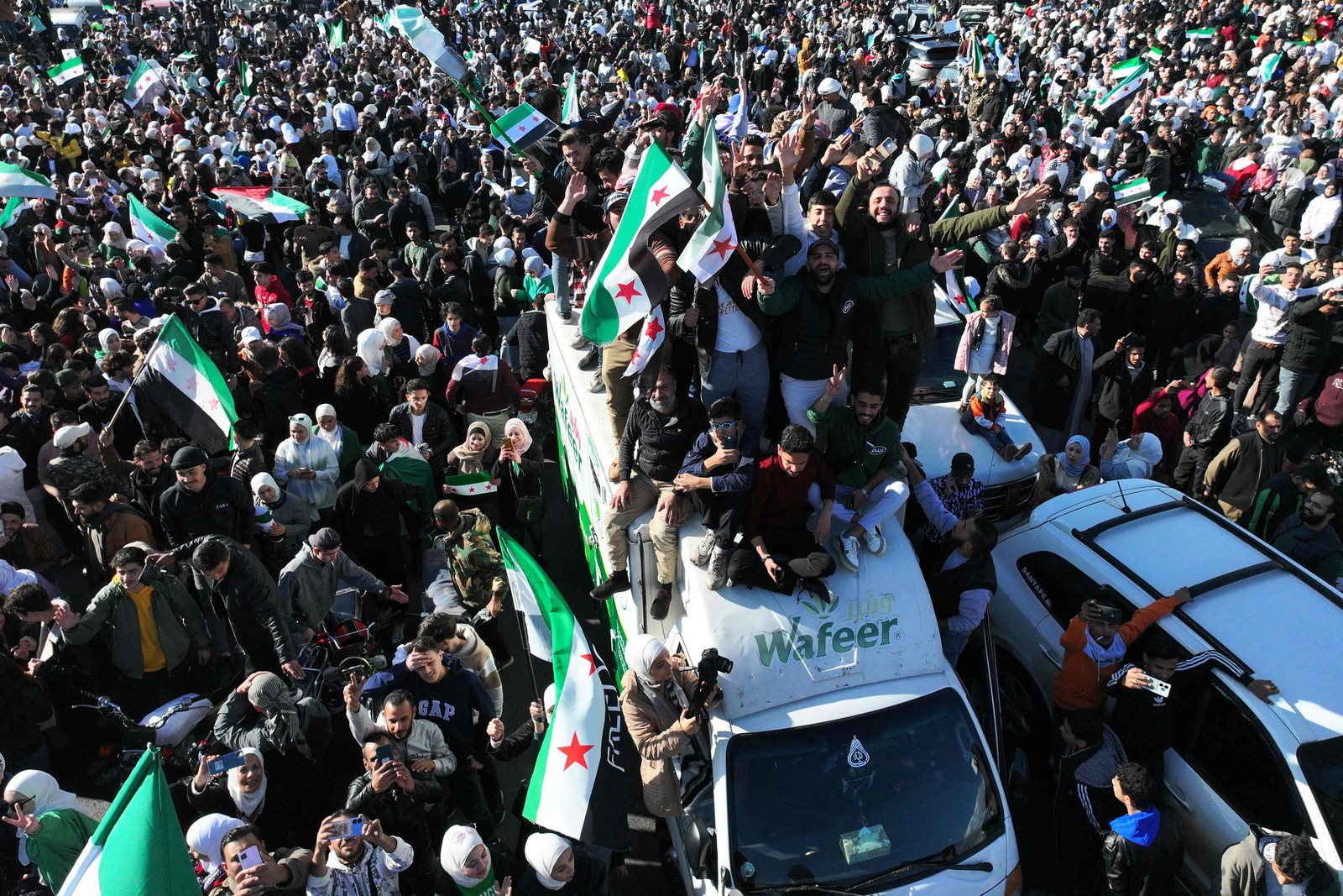 Sírios celebram a queda do governo de Assad — Foto: OMAR HAJ KADOUR / AFP