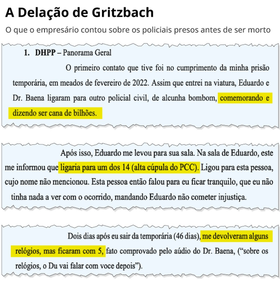 Ao Ministério Público,Gritzbach acusou Baena e Monteiro de cobrarem propina para não prender integrantes do PCC. O empresário mostrou documentos que indicam a apropriação de um sítio de origem criminosa pela dupla. O delator acrescentou que relógios de luxo apreendidos em sua casa ficaram com Rogerinho.