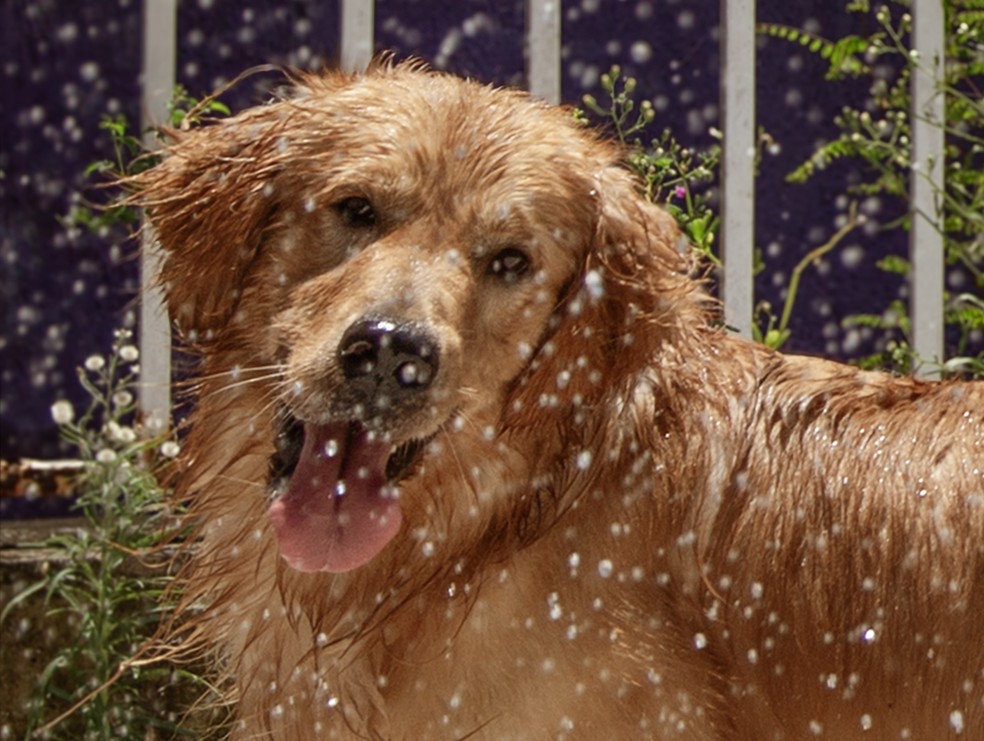 Cuidados com Pets. O cão Sol,da raça Golden Retriever se refresca com banho de mangueira — Foto: Paulo Moreira / Agência O Globo