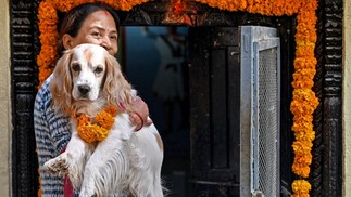 Com guirlandas de calêndula em volta do pescoço,em um dia dedicado ao amigo leal da humanidade como parte de um festival hindu — Foto: PRAKASH MATHEMA / AFP