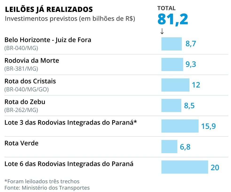 Dos 35 trechos prometidos,nove foram concedidos nos primeiros dois anos de governo,com previsão de investimentos nos próximos anos da ordem de R$ 80 bilhões (Capex). Apesar de o resultado estar longe da meta,já superou a gestão de Jair Bolsonaro,que repassou seis rodovias à iniciativa privada.