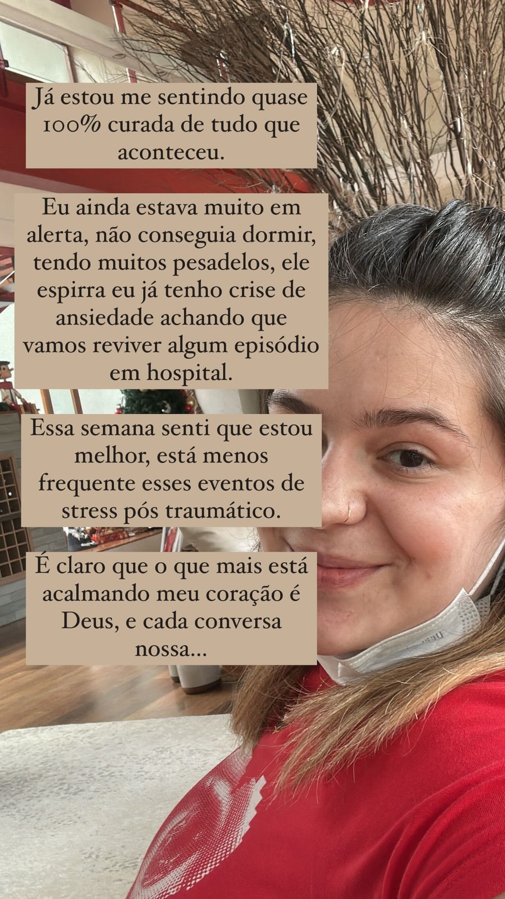 Nos stories publicados na plataforma,Viih Tube contou que pode sentir uma recuperação apenas nesta semana. “Essa semana senti que estou melhor,estão menos frequentes esses eventos de estresse pós-traumático. É claro que o que mais está acalmando meu coração é Deus,e cada conversa nossa.”