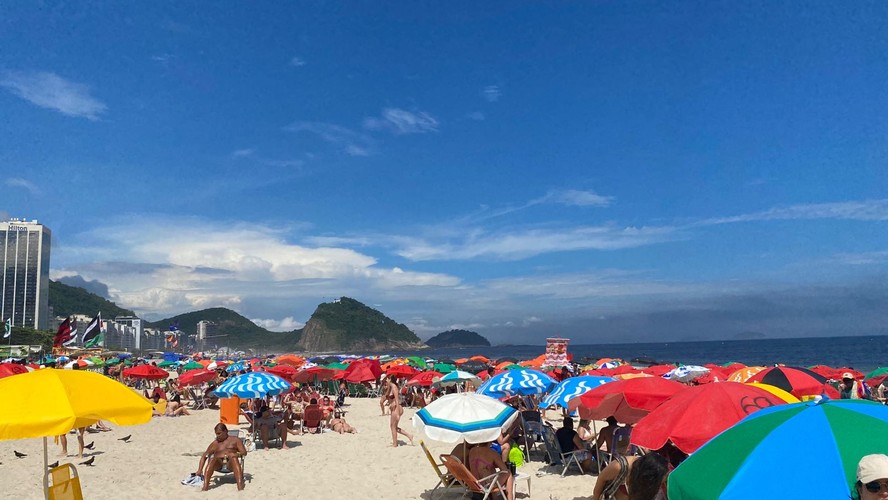 Em Copacabana,o sol faz a alegria de cariocas e turistas neste sábado — Foto: João Vitor Costa RESUMOSem tempo? Ferramenta de IA resume para você