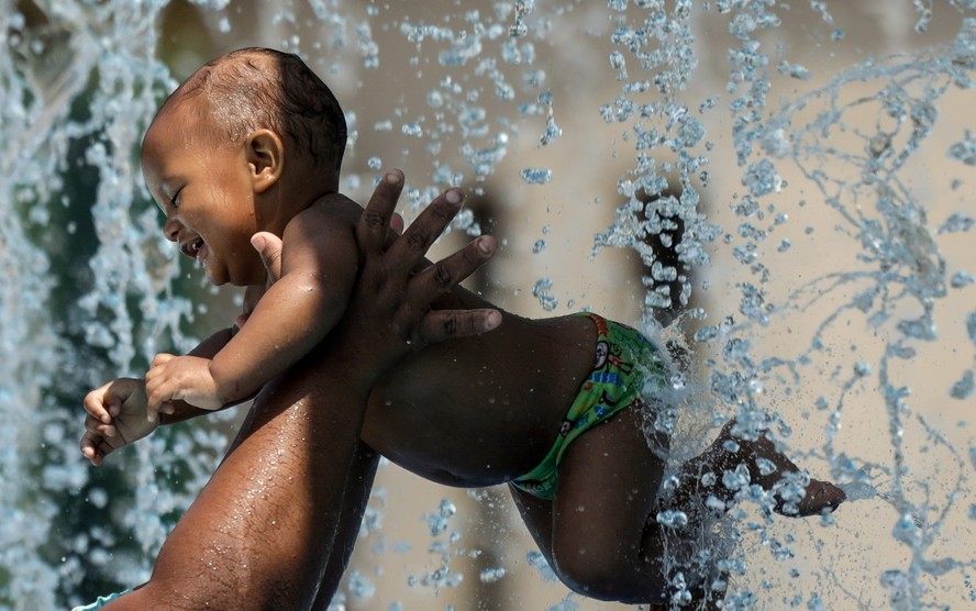 O bebê Daniel,de 10 meses,se refresca no Parque Madureira em dia de forte calor no Rio — Foto: Gabriel de Paiva / Agência O Globo