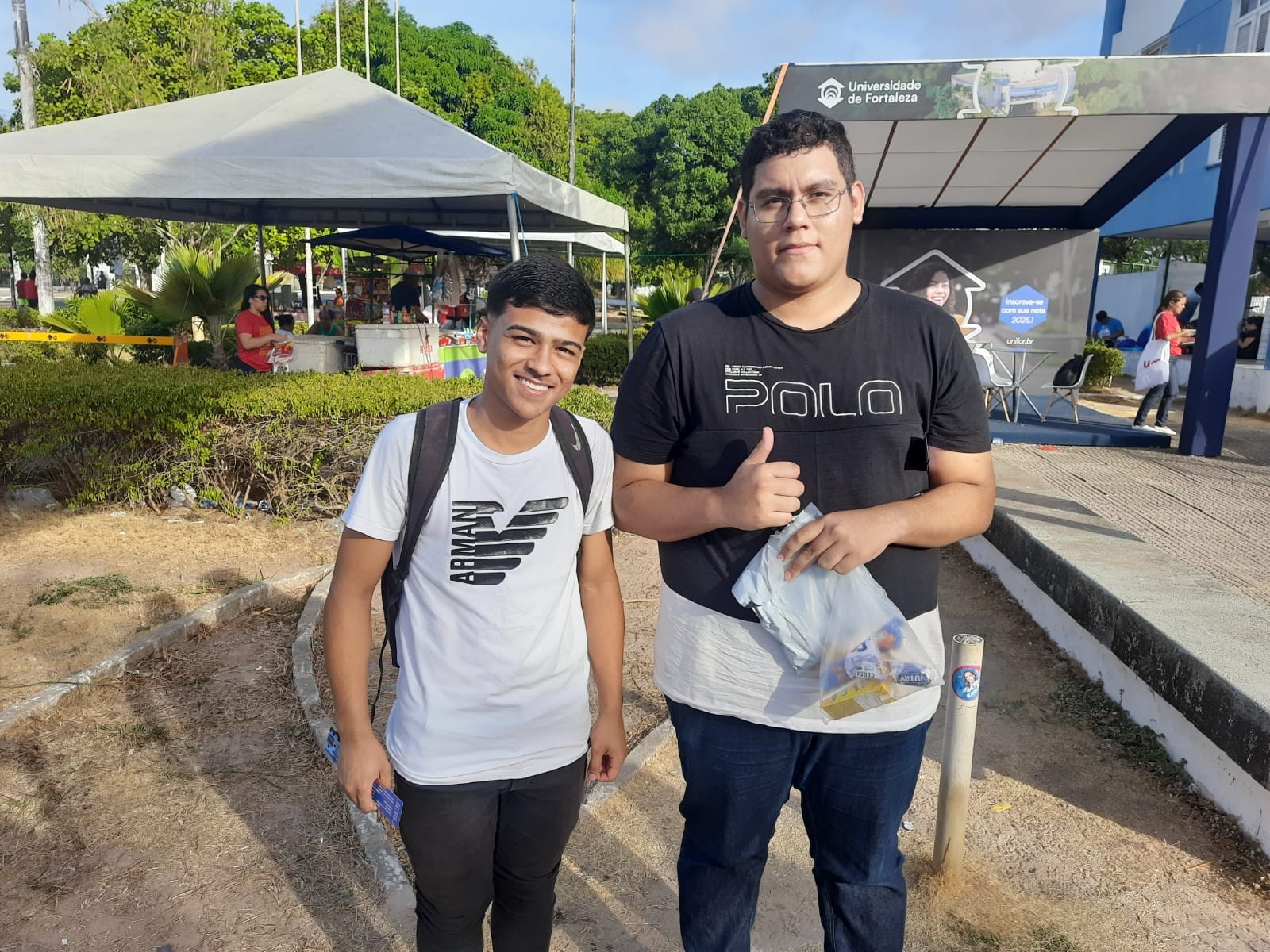 Os estudantes Pedro Guilherme,de 17 anos,e João Victor,deixaram o prédio da Universidade Estadual do Ceará (Uece),em Fortaleza,cerca de duas horas após o início das provas do Enem,neste domingo,por conta da ansiedade pelo resultado da partida entre o Ceará e Avaí — Foto: Thiago Paiva