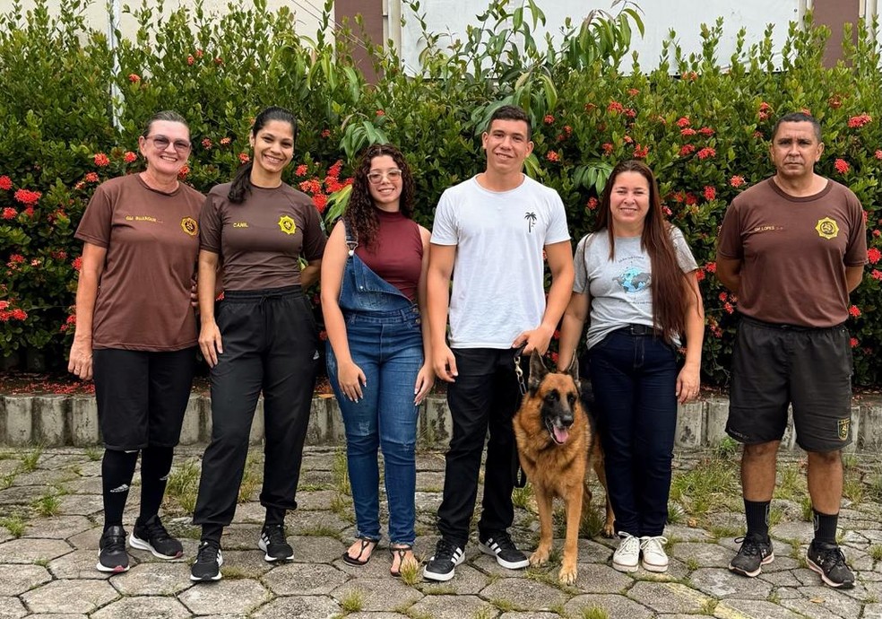 Fuzileiro naval Renan de Sousa e a família ao lado do pastor alemão Nestor,na despedida do canil da Guarda Municipal — Foto: Divulgação / Guarda Municipal