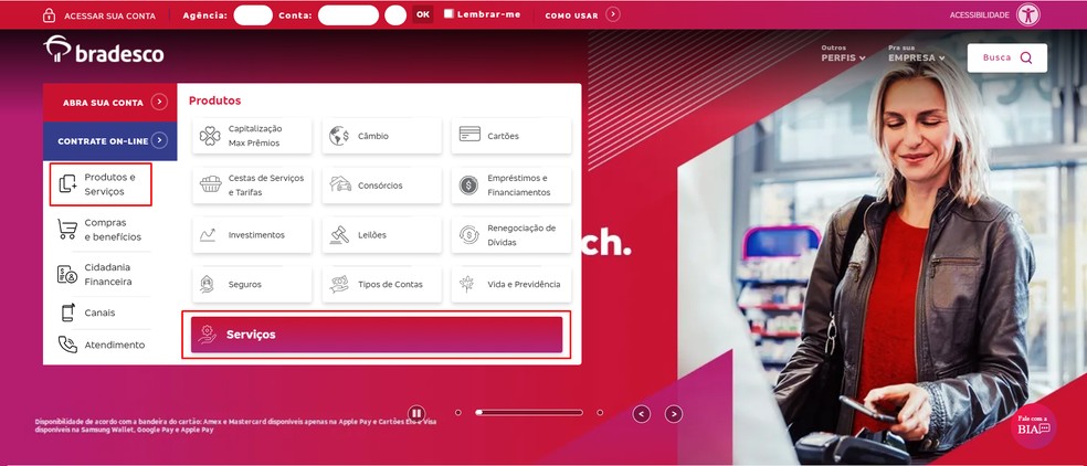1 - Acesso o site do banco Bradesco. Clique em "Produtos e serviços". Em seguida,em "Serviços".