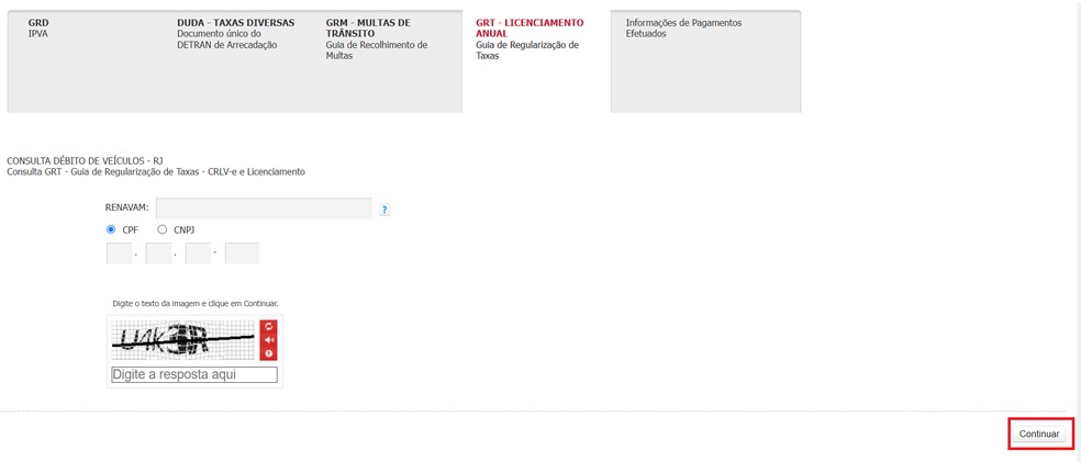 5 - Preencha o número do Renavam do veículo e o CPF do proprietário. Repita o código de segurança exibido e clique em "Continuar",botão que fica no canto inferior direito da tela.