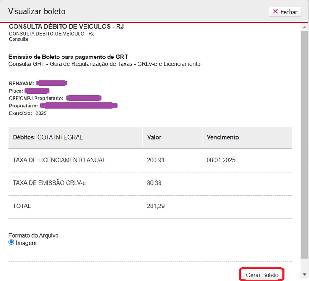 Será exibido,num pop-up,o "Resumo DARJ",onde constam o número do Renavam,o ano calendário do imposto,a cota (única; 1 de 3; 2 de 3; ou 3 de 3),o valor do documento,e data de vencimento.Para o pagamento,são exibidos código de barras (a ser paga em bancos parceiros da Fazenda estadual: Bradesco,Santander e Sicoob) e QR Code (transação via pix que pode ser quitada em qualquer instituição financeira).Ambos têm a opção de "copia e cola" para facilitar o pagamento.O proprietário do veículo deve escolher uma das formas de pagamento.