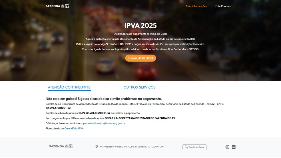 Guia de IPVA 2025 no RJ começa a ser emitida em 8 de janeiro — Foto: Sefaz-RJ / Reprodução