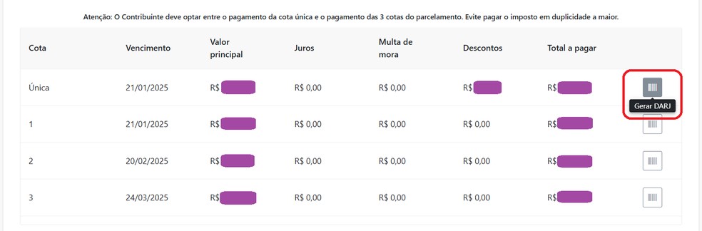 Nela serão exibidos os dados do veículo,sendo eles Renavam,placa,ano de fabricação,marca,e modelo.O motorista deve ficar atento para o ano calendário,indicado logo abaixo desses dados.Na mesma página também constam os dados do proprietário do veículo,sendo nome,CPF e município de emplacamento.Os boletos estão disponíveis na mesma página. É preciso ficar atento! Quem for realizar o pagamento em cota única (que dá desconto de 3% no valor total),deve escolher a primeira opção apenas. O documento trará o valor integral a ser pago para ficar regularizado. A data de vencimento é de acordo com a placa (confira o calendário completo abaixo).Já quem optar por parcelar em três cotas,também terá acesso a todos os documentos A primeira cota vence ainda neste mês de janeiro,de acordo com a placa (confira o calendário completo abaixo).É possível fazer o download das três guias de uma só vez. Mas é preciso ter atenção caso perca a data de vencimento para ser emitido um novo documento com o valor reajustado com os juros.