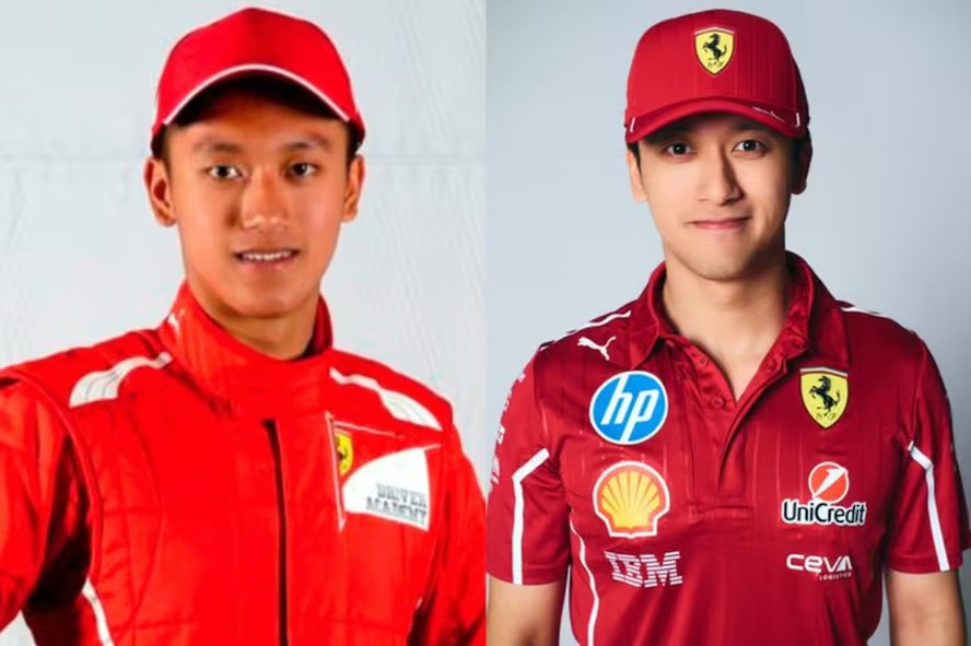 Guanyu Zhou em 2014,quando se juntou à Ferrari Driver Academy,e em 2025,quando estiver de volta a Maranello,mas como piloto reserva na Fórmula 1 — Foto: Reprodução/X