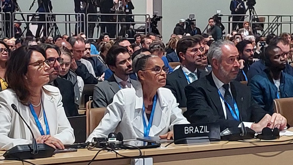 A ministra do Meio Ambiente,Marina Silva,discursa na COP29 em Baku,no Azerbaijão — Foto: Solange Barreira/Observatório do Clima