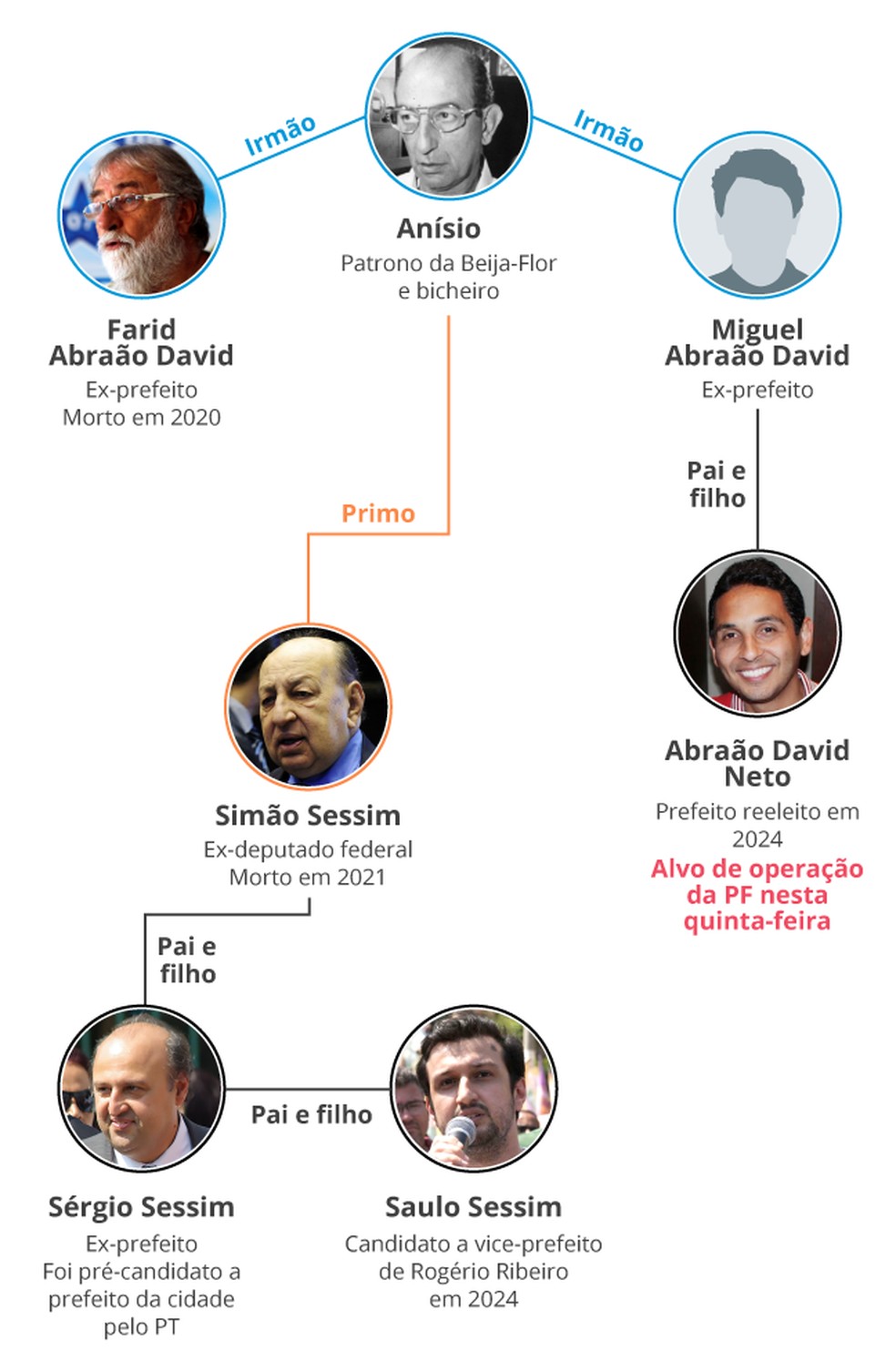Alvo de operação da Polícia Federal (PF) nesta quinta-feira,o prefeito de Nilópolis (RJ),Abraão David Neto,protagoniza uma disputa pelo espólio eleitoral das famílias Abraão e Sessim e pelo controle da escola de samba Beija-Flor,sediada no município da Baixada Fluminense gerido por ele e sob influência de seus parentes há mais de cinco décadas. Sobrinho do bicheiro e patrono da escola Aniz Abrão David,conhecido como Anísio,Neto vem brigando por espaço com o primo,o ex-prefeito da cidade Sérgio Sessim,após o vácuo deixado por lideranças políticas mais velhas do clã.