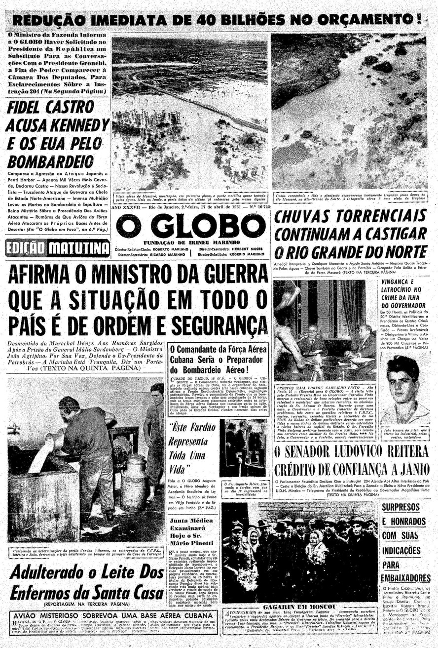 Jornal O Globo,de 17 de abril de 1961,destaca discurso de Fidel Castro contra Kennedy — Foto: Acervo/ O GLOBO