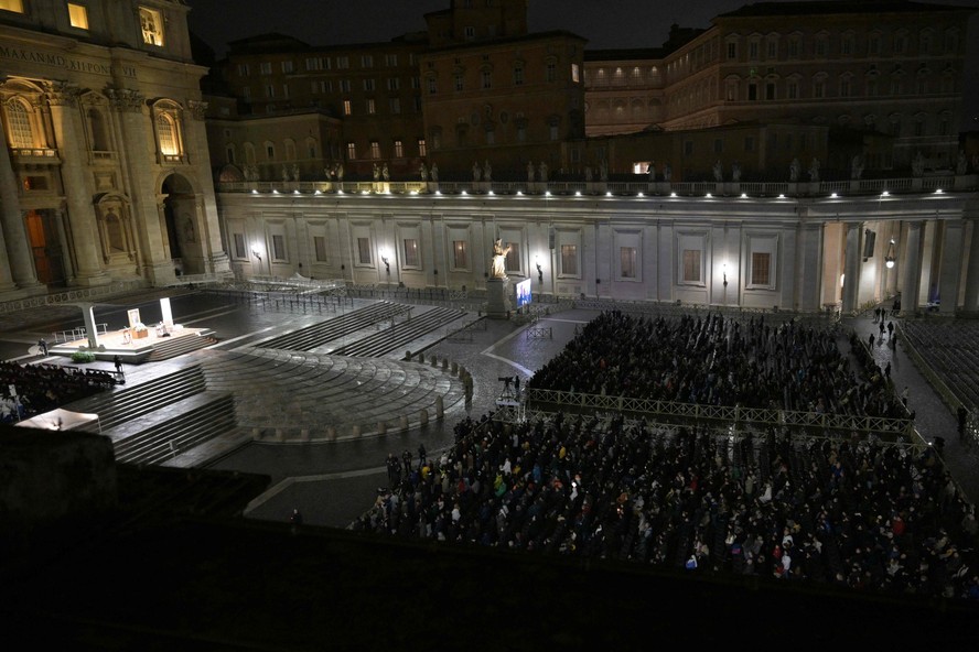 Pessoas se reúnem para uma oração do Rosário pela saúde do Papa Francisco,que está hospitalizado com pneumonia,na praça de São Pedro,no Vaticano — Foto: Tiziana FABI / AFP