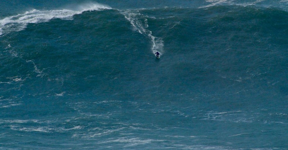 Daniel Rodrigues surfou onda de aproximadamente 27 metros em Nazaré,Portugal — Foto: Virginie Martinez